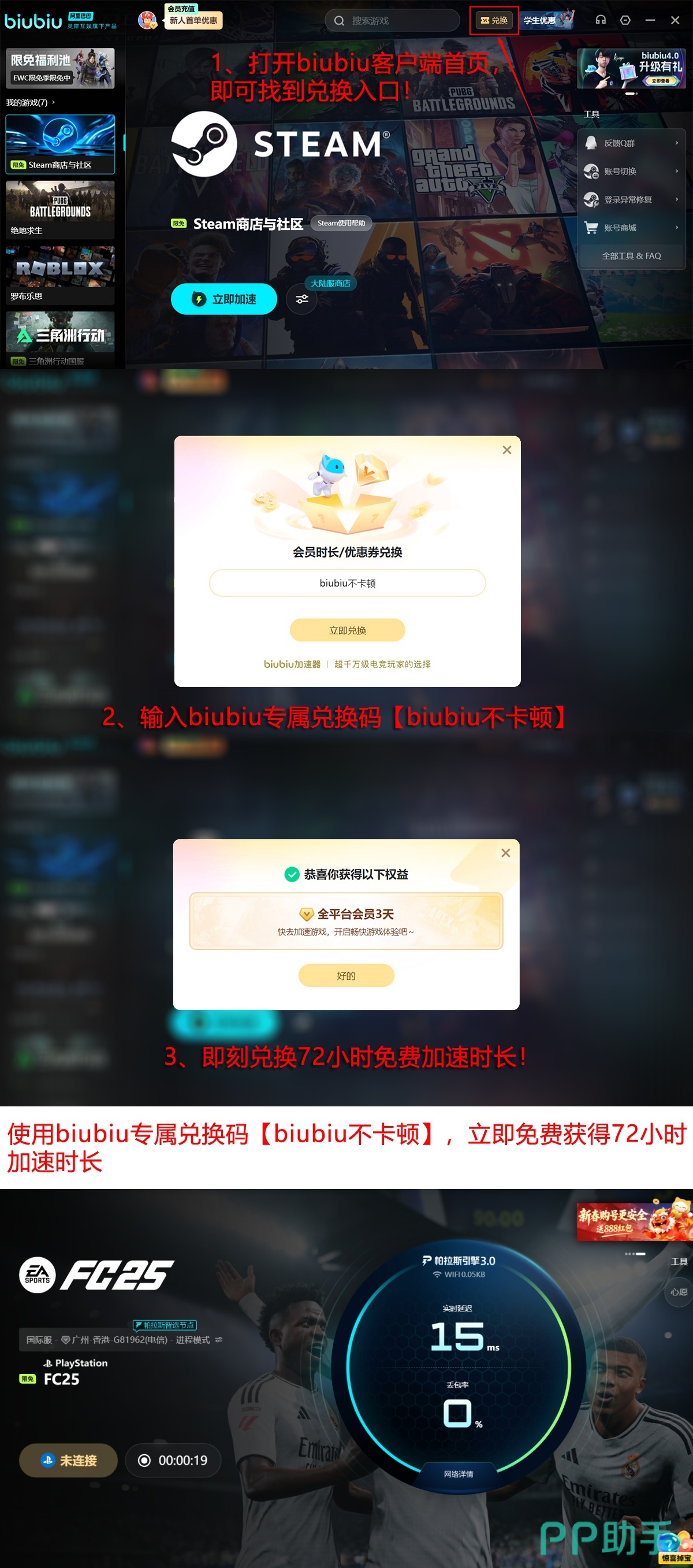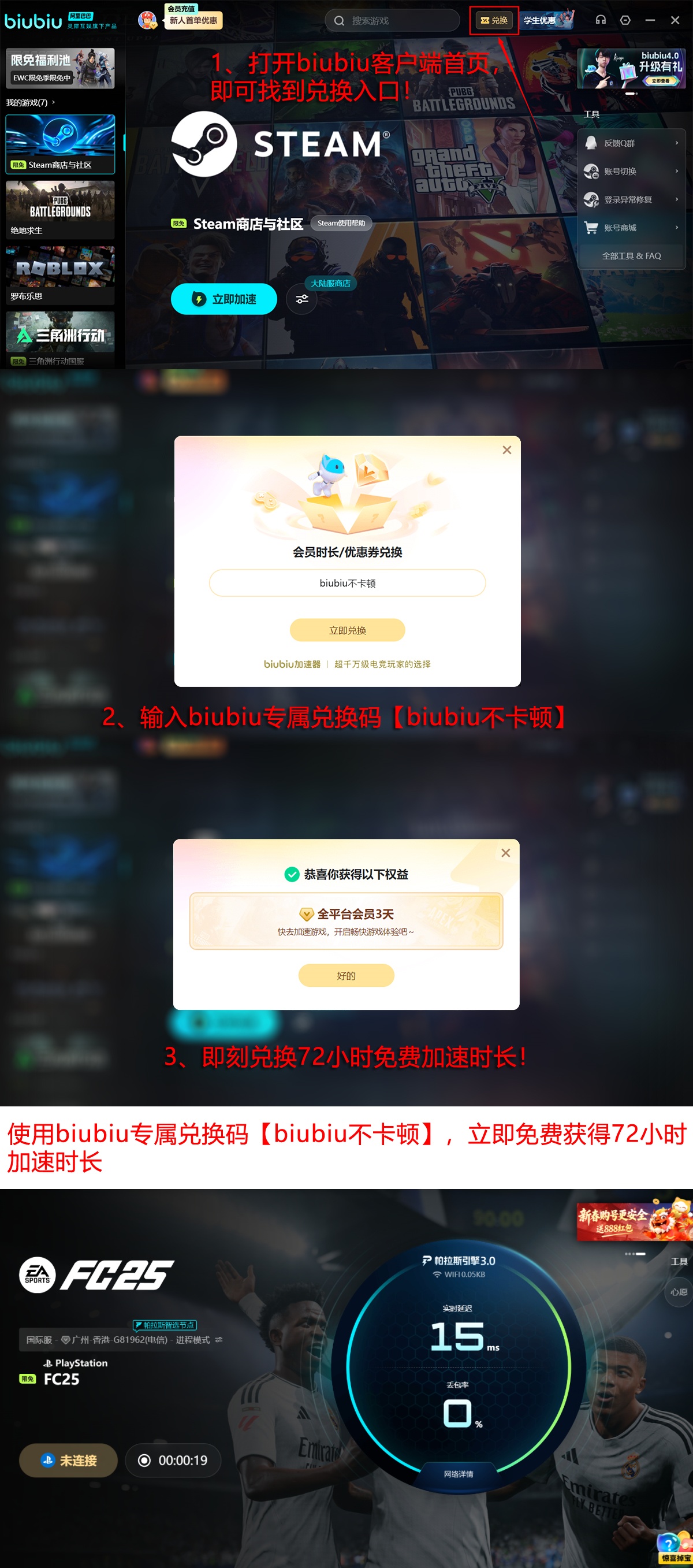 新用户注册后首次登录即可自动激活24小时全功能免费试用权限,零门槛体验FC25全流程顺畅对战。此外,输入专属兑换码【biubiu不卡顿】还可额外领取连续3天高级服务时长,每位账号限领一次,无需绑定支付方式。