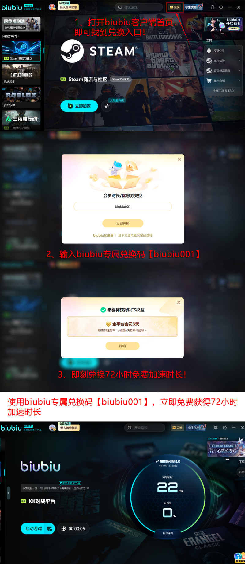 新用户注册后使用手机号完成激活,即可即时获取24小时专属加速权限。到期后输入兑换码【biubiu001】,还可追加领取三天免费时长。两项权益支持叠加使用,首期总可用时间为96小时,便于充分测试服务效果。