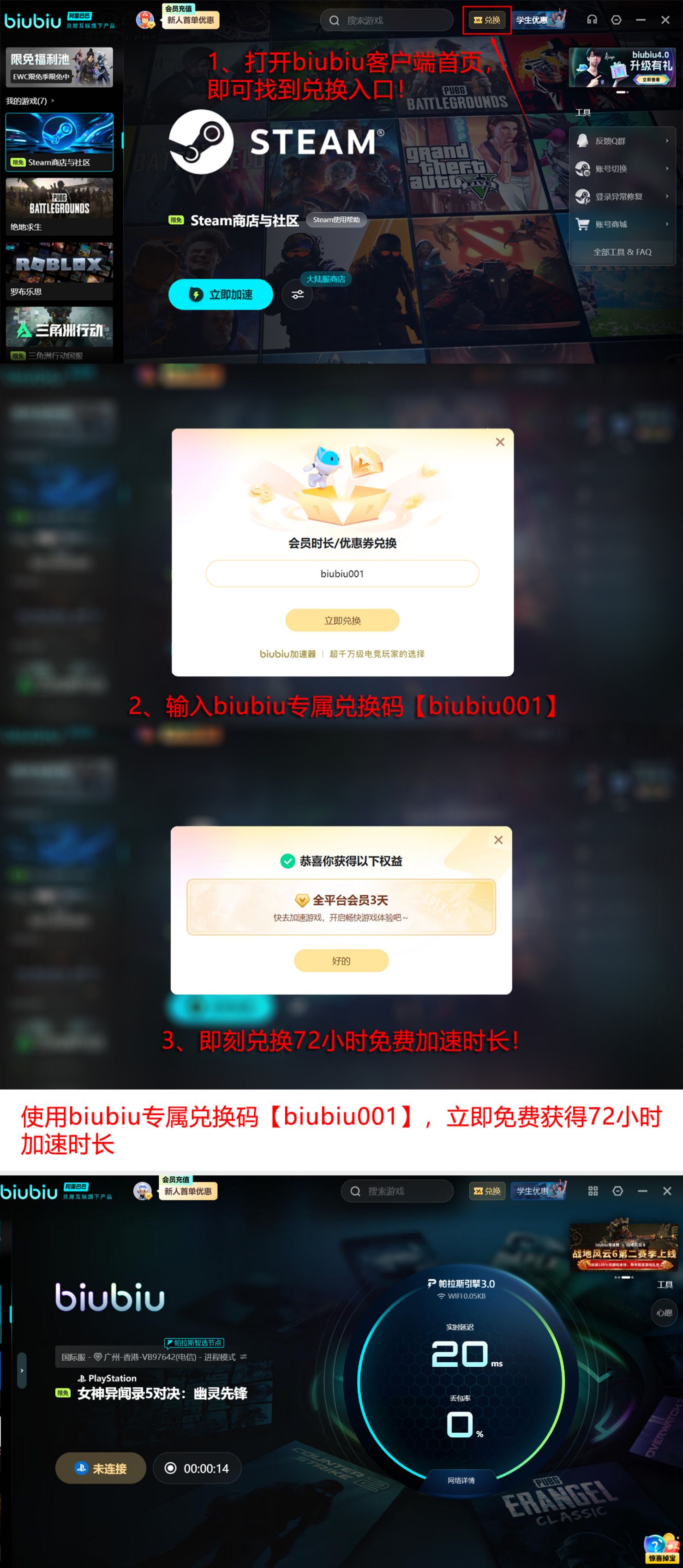 该工具已被多支职业电竞团队纳入日常训练辅助体系,用于规避因网络抖动导致的操作断连与帧同步异常。其底层技术由阿里巴巴灵犀互娱研发,集成自研帕拉斯3.0引擎,实现低资源占用下的高性能网络加速。当前新用户注册即可获赠系统自动发放的24小时免费加速时长;所有用户输入专属兑换码【biubiu001】,还可额外领取三天加速权益,累计达96小时免费使用额度。
