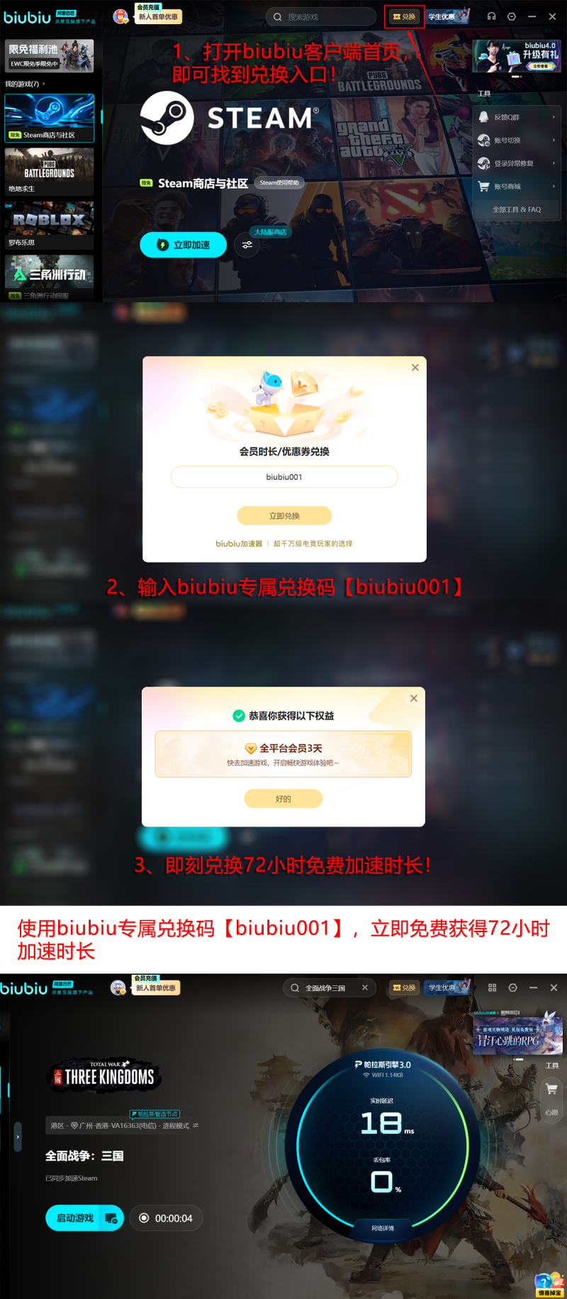 biubiu加速器在该领域具备成熟技术积累。作为PERO战队指定加速器,其帕拉斯3.0引擎由阿里巴巴灵犀互娱旗下团队研发,与九游、交易猫同属同一技术生态体系。该引擎可智能识别《全面战争:三国》通信协议特征,重构最优数据转发路径,有效规避高延迟节点与拥塞链路,从而从底层解决因网络波动导致的闪退。目前用户可通过官方页面领取专属福利:输入通用兑换码【biubiu001】,即可获得3天免费加速时长;新注册用户登录后还可额外领取24小时新手礼包,叠加使用总计可达96小时免费服务。