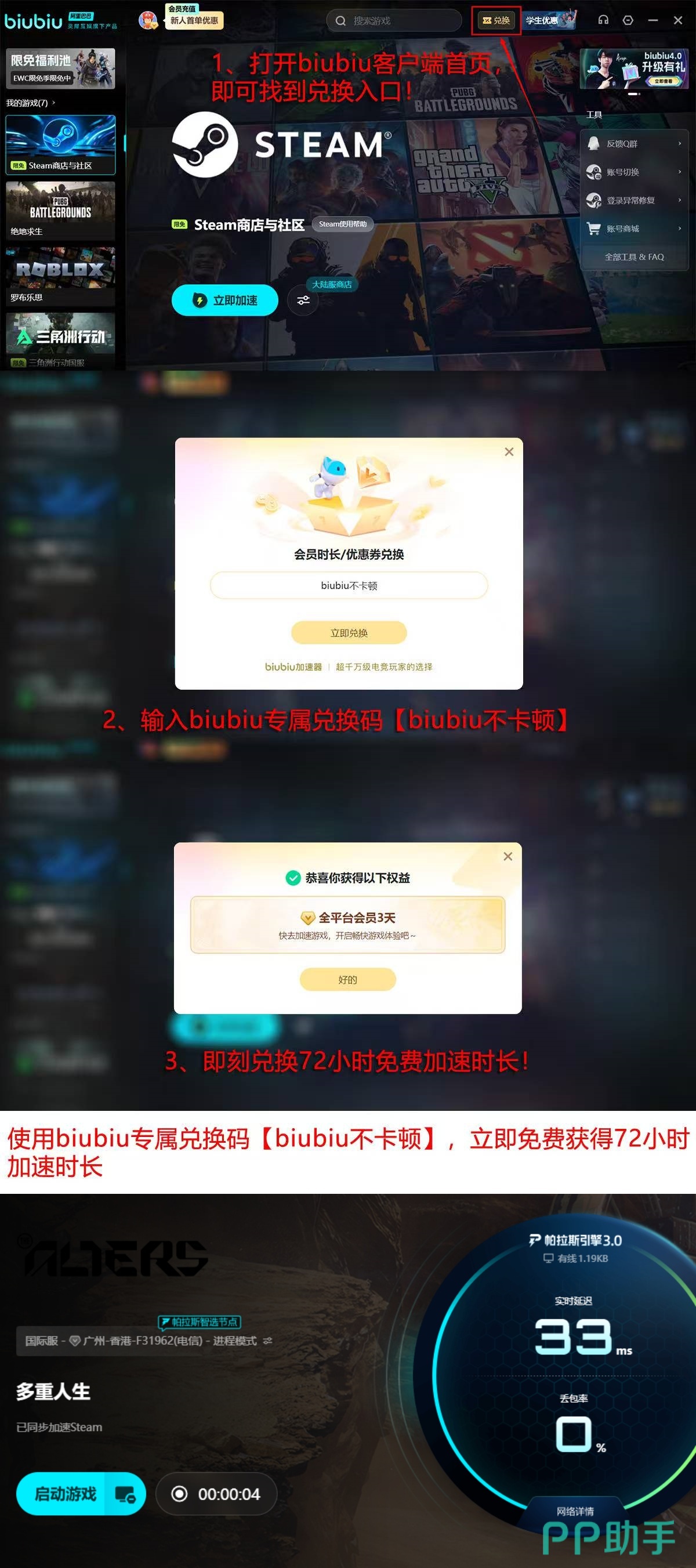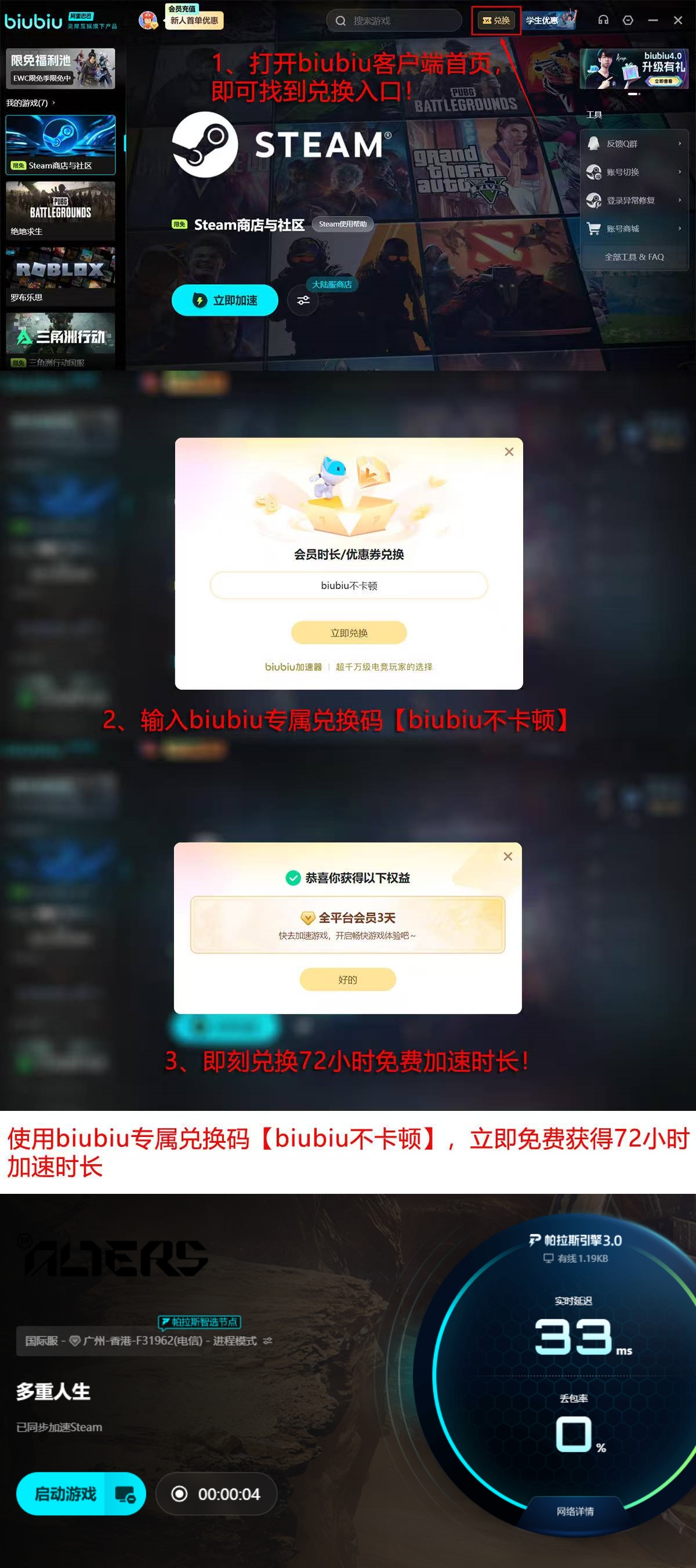 新用户首次启动biubiu加速器即可享24小时全游戏免费加速权益。此外,输入专属兑换码【biubiu不卡顿】还可额外激活72小时连续加速权限,覆盖《多重人生》全章节内容及后续DLC更新所需全部网络支持周期。