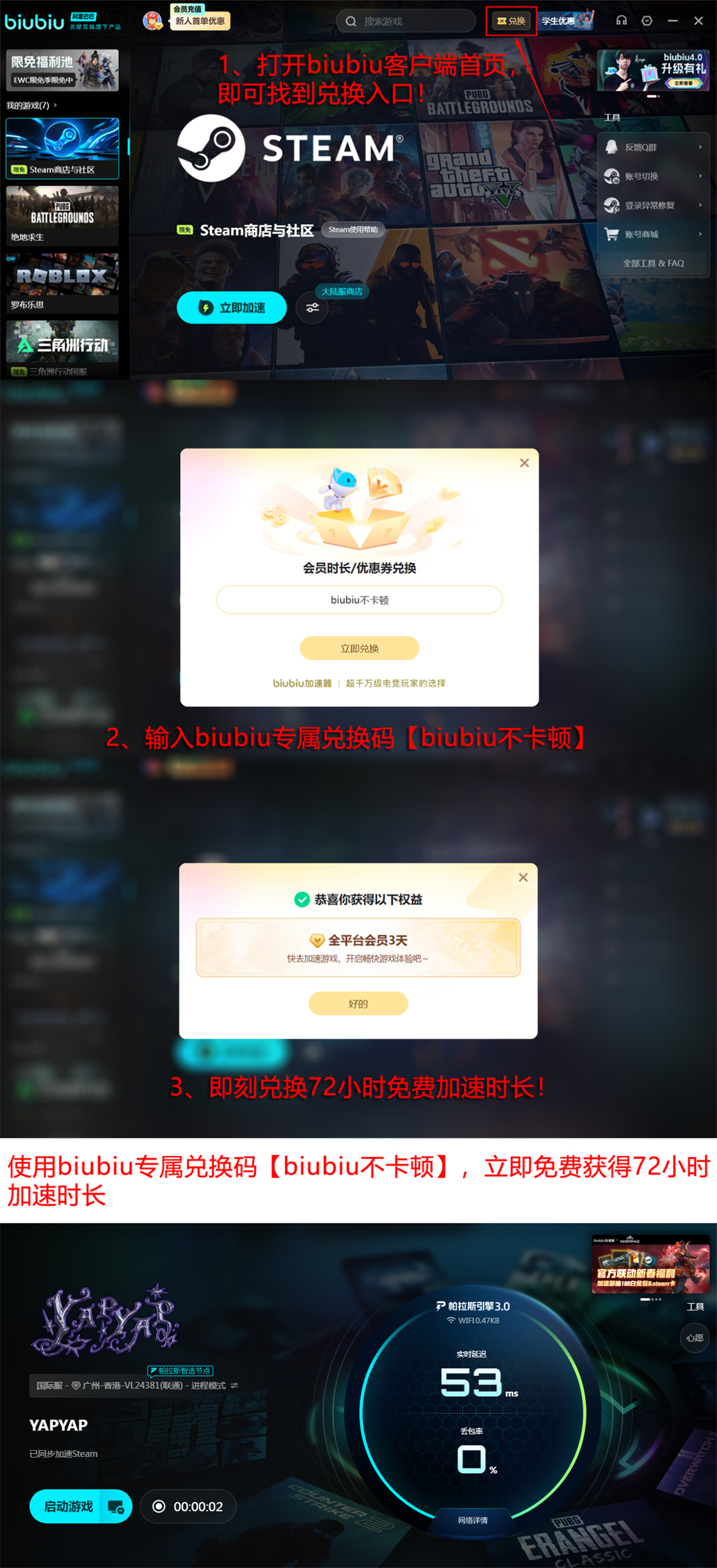 在用户权益方面,biubiu提供双重免费体验机制:新注册账号默认享有24小时无门槛加速时长;同时,所有账号均可凭兑换码【biubiu不卡顿】额外领取72小时加速权限。两项叠加后,新用户实际可获得总计96小时的完整试用周期,充分满足YAPYAP中长局对网络稳定性的持续需求。
