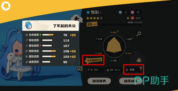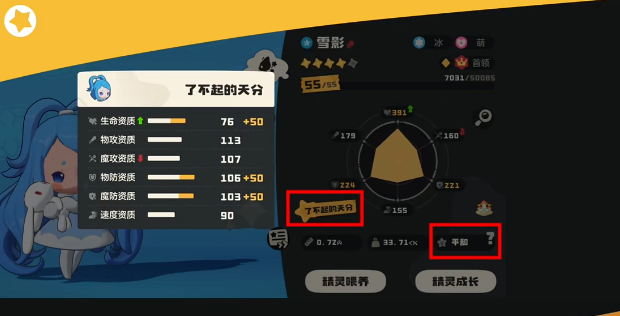 将血脉更换成首领血脉之后,然后配合进化之力,就能进一步的挖掘战斗的潜力。首领血脉就需要先挑战各个区域的精灵副本,打败首领之后就可以掉落神秘蛋,孵化之后可以获得带有首领血脉的精灵,然后收集10个首领血脉碎片,就可以去完成进化。雪影娃娃的种族值达到595,各项属性有缺点也有优点。生命数值只有76属于偏低的水平。所以雪影娃娃的短板还是比较明显的,不过攻击方面相对比较亮眼,魔法攻击达到107,物理攻击达到113。