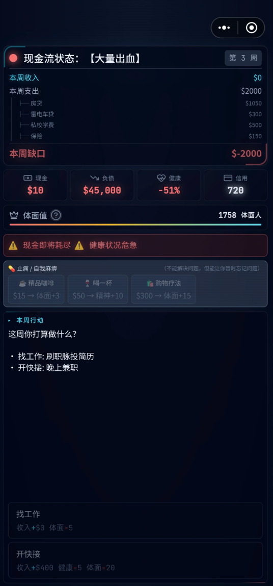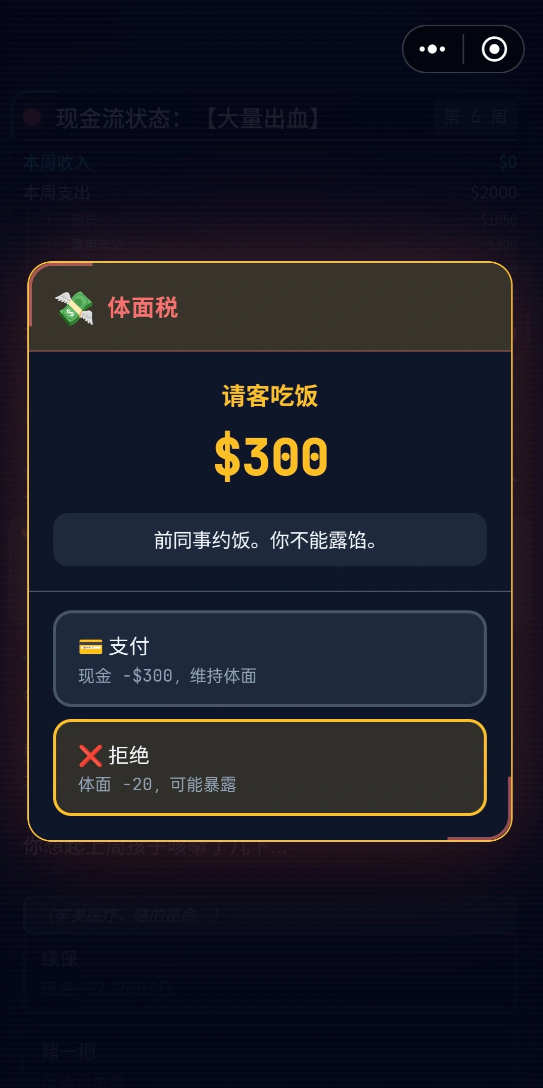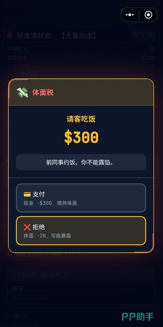 游戏内会有一些突发的经济危险发生,比如图中的“体面税”,如果不为了主人公的“体面”花费游戏里的资金,这场简单的“约饭”可能就会成为玩家操控的角色摔进“斩杀线”的重大契机。如果没有办法解决这种突然跳出的恼人事件,就可以试试这些兑换码:有VIP666、VIP777和VIP999一共三样码。这些兑换码都仅有一次的兑换机会,可不要浪费在无关紧要的“报纸”,“约饭”上哦!