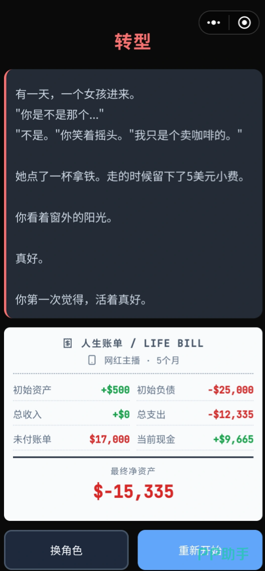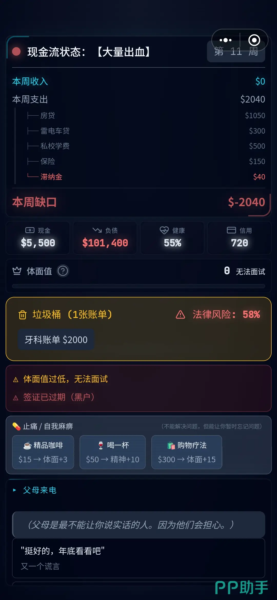 房贷车贷,还有医院等的各种账单,在重重的经济压力下,精神压力也随之袭来。千万不要忘记自己操控的角色有一定的心里接受范围,一旦超出,就会落入精神崩溃的“精神斩杀线”,这时候就要把重心放在更容易令游戏结束的一边。痛觉侵蚀着主人公的身心,越沉沦只会越不“体面”,这局能否闯过这些困境,慢慢从大量出血的现金流中变好呢?最终,从社交名流跌落至街头恶犬,还是从底层做起,名震一方呢?尽在游戏中等待大家去尝试。