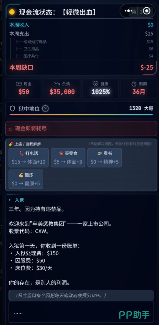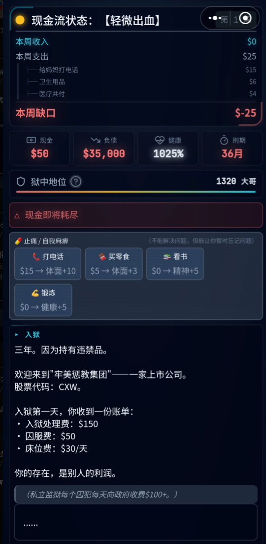 以私立监狱囚犯这一可玩角色为例子,自己的各项数据分栏列出,易见到该角色健康值很高但是现金和负债等数值不太乐观,非常容易触碰到斩杀线的阈值。使用这个角色时,玩家需要注意自己的“现金”状态栏和“健康”状态,当状态较低时需要想办法回正。一定要注意自己的“狱中地位”这一数值,这既是狱中生活水平的体现,更能为三年之期后的补足现金流漏洞打下基础。可别忘了,牢美的监狱也是收费不少的!好好算计自己的储蓄能否坚持到出狱吧~