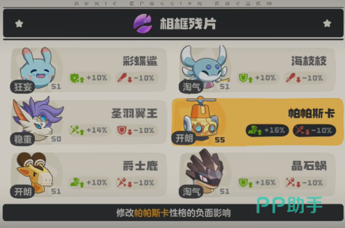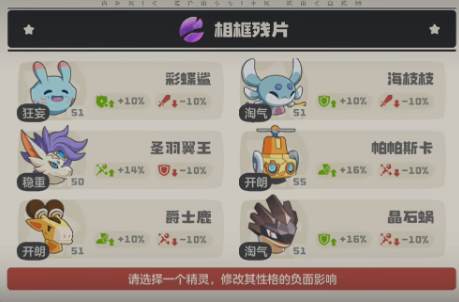 想要调整精灵的性格,那核心的道具自然就是相框残片,这也是性格定向的主要优化关键。不过使用这款道具,就有一个首要的原则,只能去修改性格中的减益属性,已经确定的增益属性是没有办法更改的。例如精灵是胆小性格,例如精灵是胆小性格,本身就会加速度,还有减物攻,那使用相框残片之后就可以把减物理性攻击更换成减魔法攻击,但是加速度的增益就会一直保留下来。但如果想要培养固执的精灵,那必须要抓到带有物理性攻击增益的个体。