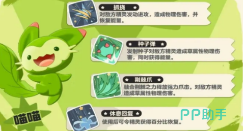 你想发展成一个稳健、有高生存能力并且能够长期作战的玩家的话,那么喵喵就是你最好的选择。作为一只草系精灵的喵喵有很强的自我修复能力。释放出草系技能之后它会为自身恢复生命值,在战斗过程中它的生存能力更强。喵喵的技能“种子弹”、“休息回复”等可以给它提供不断的回复,使它无论长时间战斗也可以保持较好的状态。虽然它比火花的攻击要弱一些,但是它却可以给团队带来非常重要的作用,在不断的持续恢复的过程中发挥出它最大的价值。对于初学者或者是希望渐进的玩家来说,喵喵是他们的良师益友。
