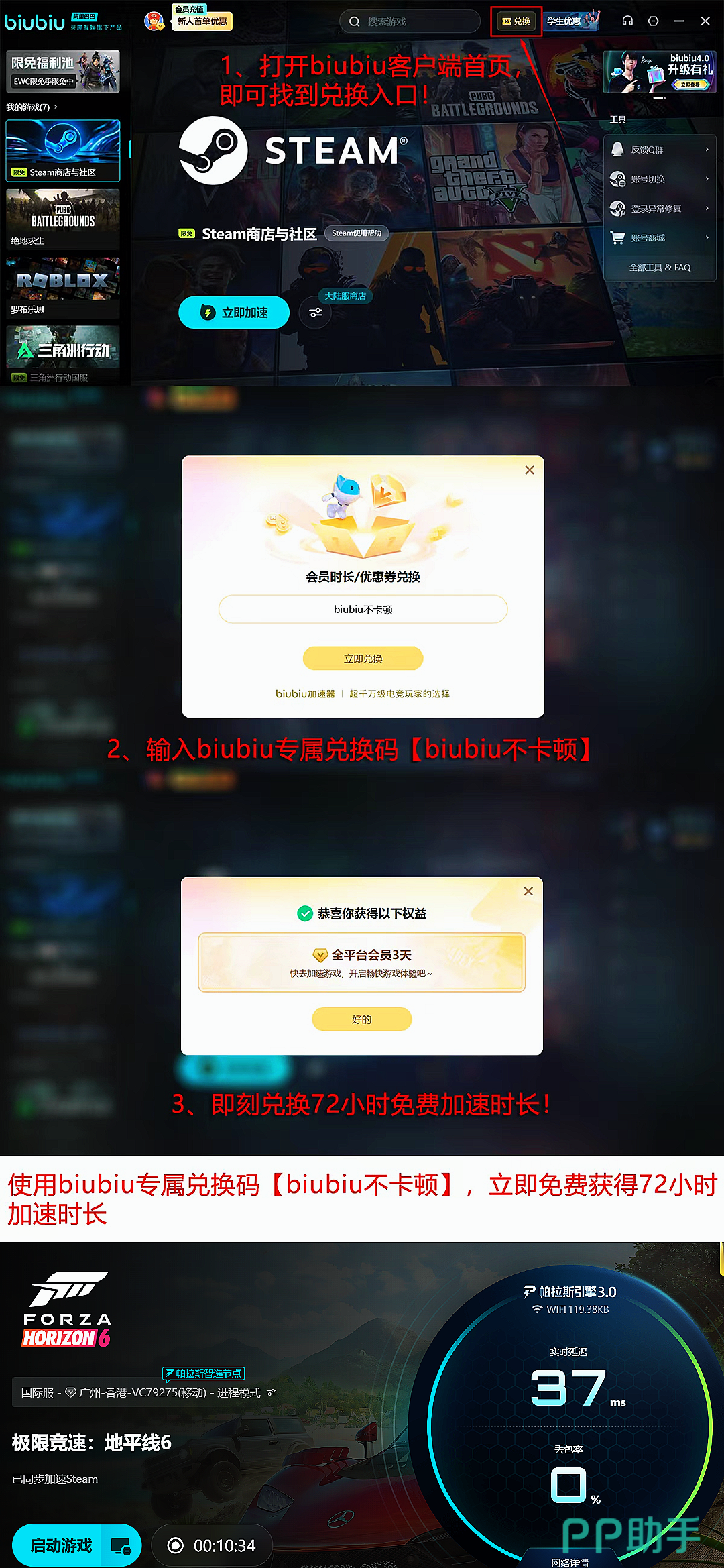 新用户注册后可立即获得24小时全游戏免费加速服务;所有用户输入兑换口令【biubiu不卡顿】,还可额外领取3天加速时长,保障《极限竞速:地平线6》上线初期的稳定联机体验。