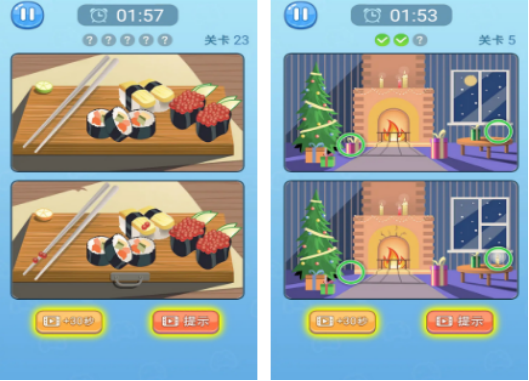 面向全年龄段设计的观察力训练工具,采用双图对比模式。开局呈现上下并列的两张高度相似图像,差异点分布于细节部位,如配饰位置、背景元素增减、光影明暗变化等。玩家须在倒计时结束前定位全部差异项,题库覆盖动物特写、城市街景、自然生态等多种图像类型,单局时长控制在90秒内,适配碎片化使用场景。