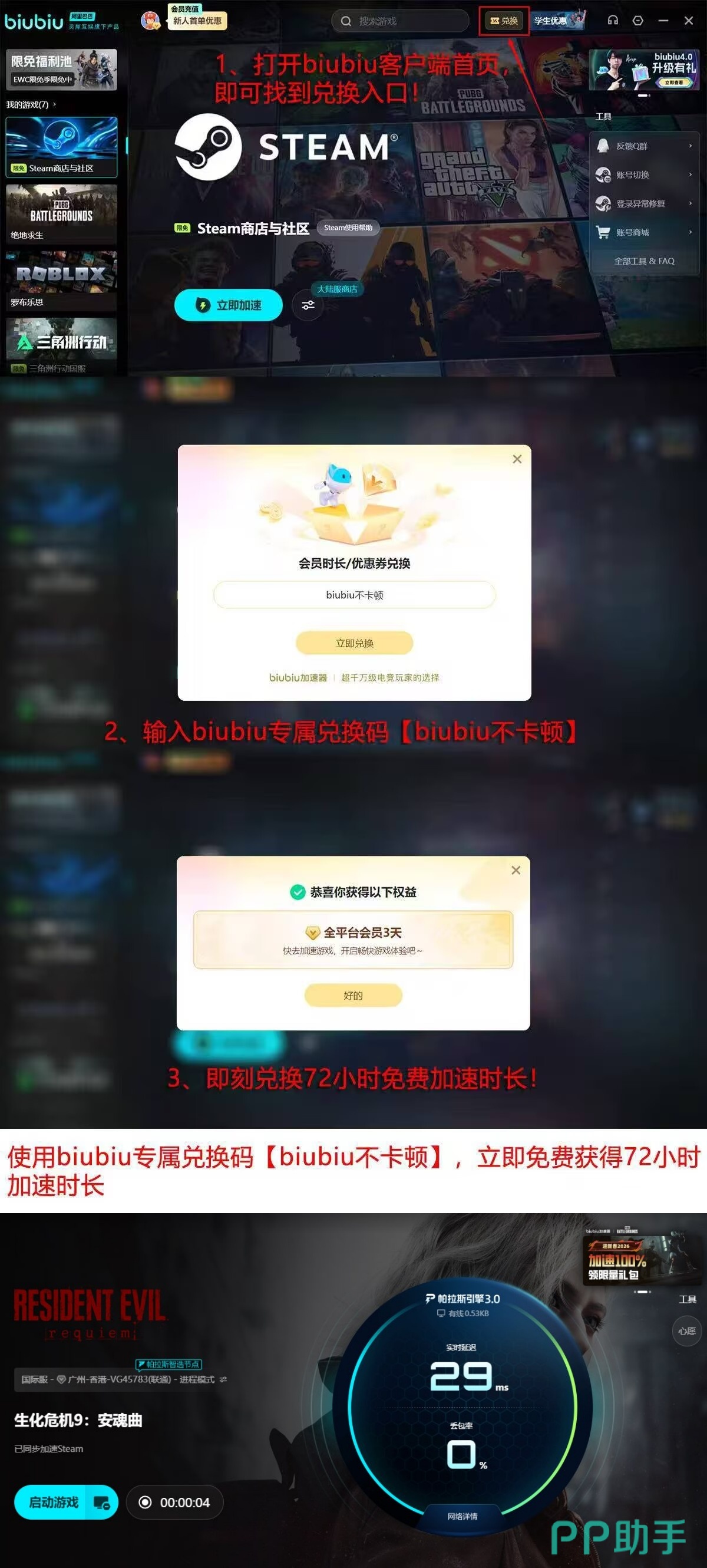 为助力玩家顺畅通关初期关键章节,biubiu加速器推出新用户专属激励计划:完成首次注册即可获赠24小时全游戏加速权益;输入激活口令【biubiu不卡顿】,还可额外领取3天连续加速服务,累计达4天,完整覆盖酒店区域全流程挑战。后续开通会员亦享多重阶梯折扣方案。