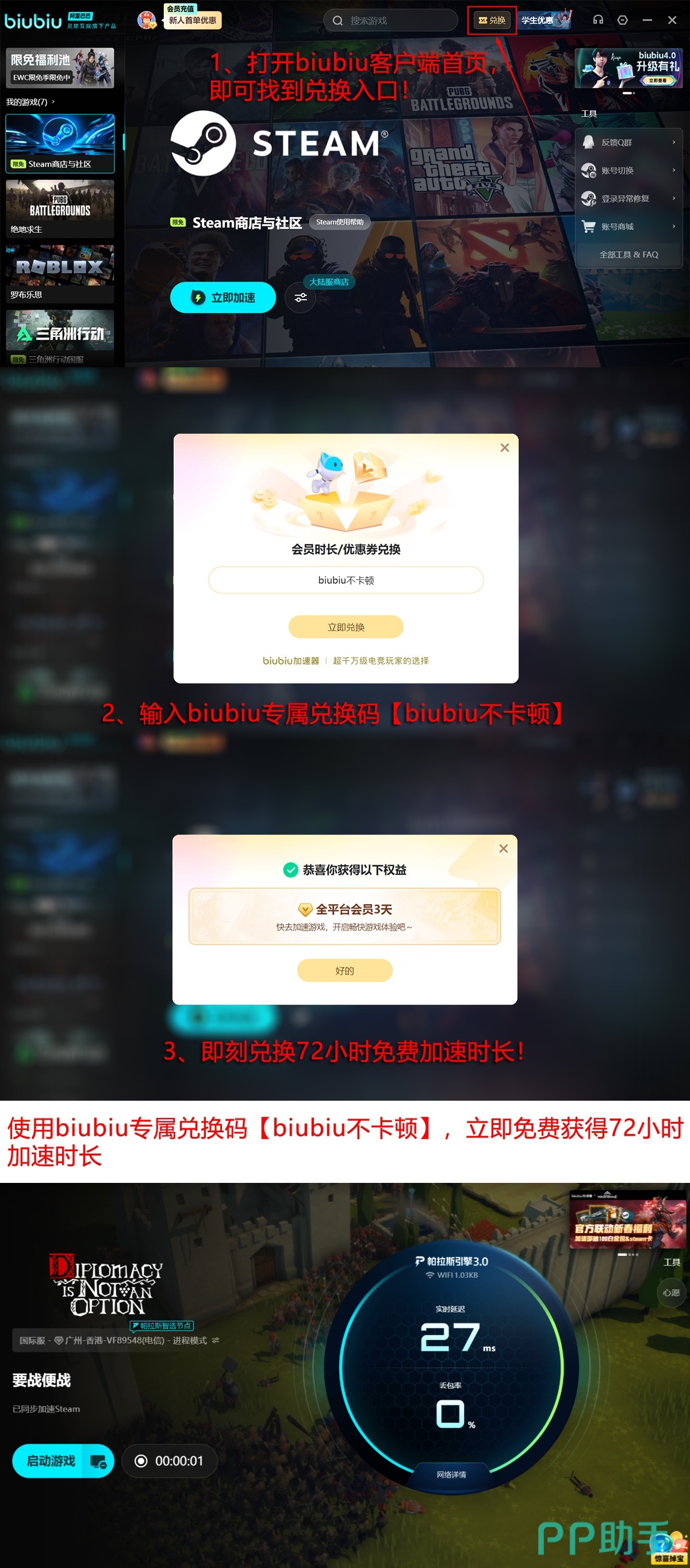 当前,所有用户均可凭兑换码领取三日免费加速权益,口令为【biubiu不卡顿】,输入后即可即时生效。首次注册的新用户还将额外获赠24小时专属加速时长,累计可享总计96小时的完整体验周期。