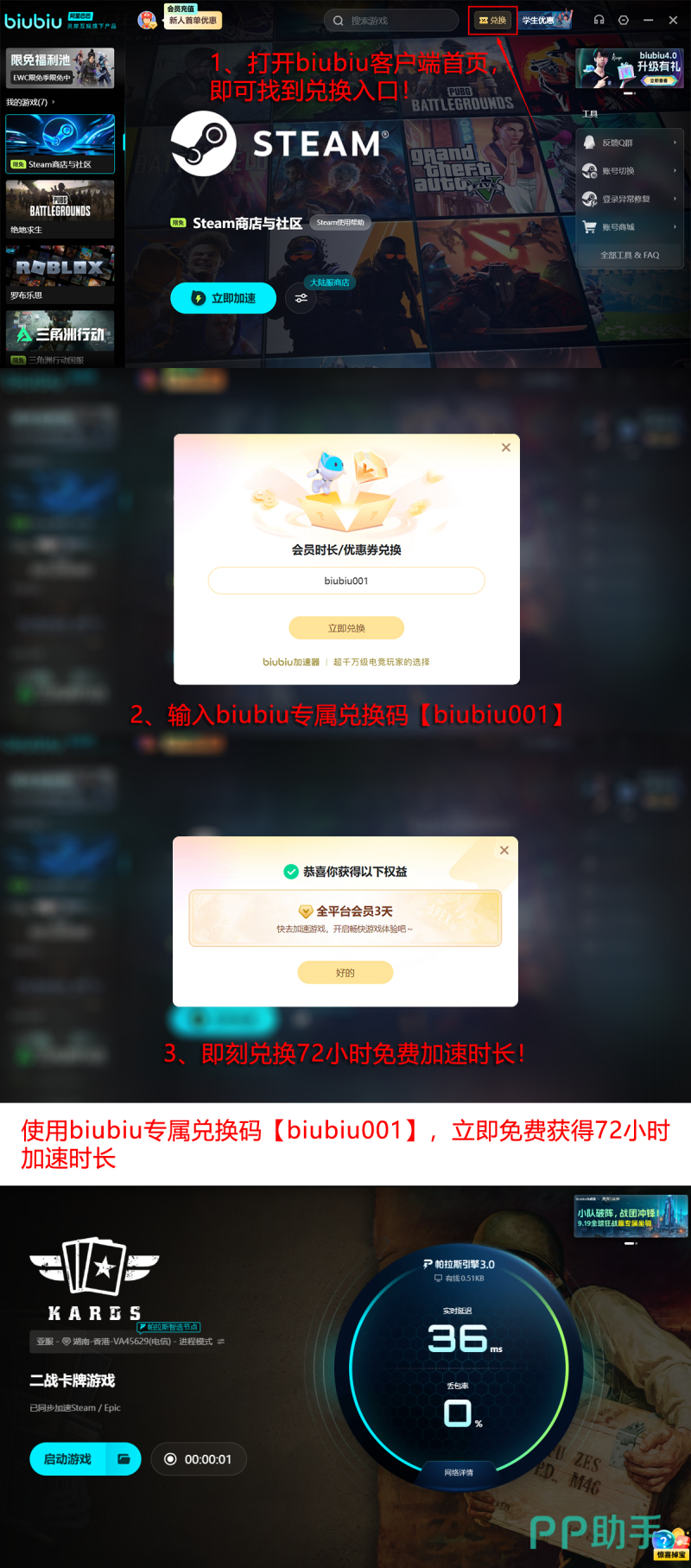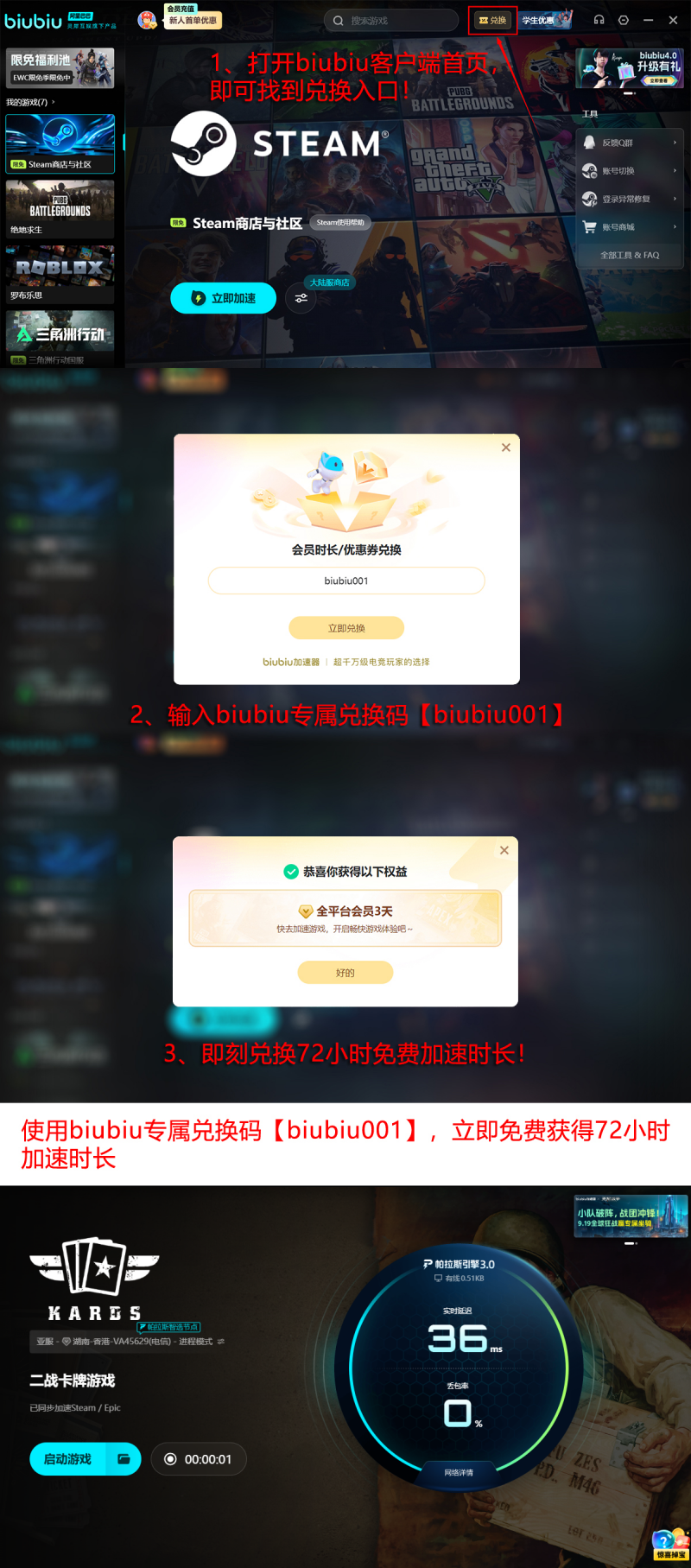 biubiu加速器采用极简交互逻辑:安装后打开主界面,在搜索栏输入“KARDS”即可一键匹配专属加速通道,全程无需手动配置协议或端口。新用户注册成功后自动获赠24小时全功能免费试用期;试用结束后,输入激活码【biubiu001】还可额外领取3天加速权益。两项福利叠加使用,总计可享96小时无限制加速服务,覆盖完整新手体验周期。