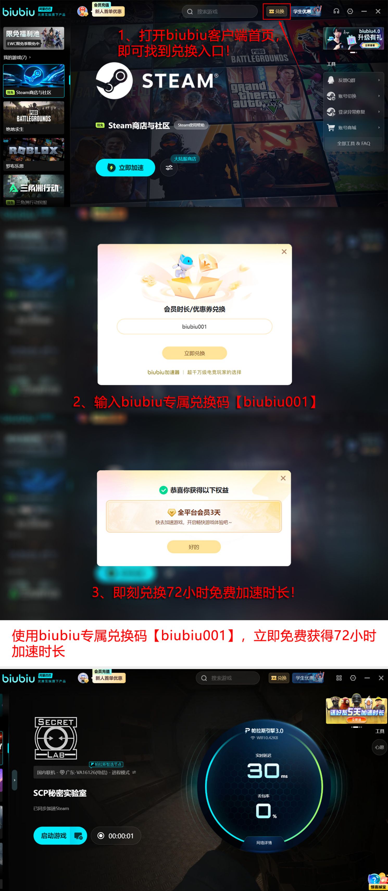 作为九游、交易猫与biubiu加速器三大产品的技术支撑方,阿里巴巴灵犀互娱持续投入网络加速底层研发。当前新用户注册即可获赠24小时免费加速时长;另提供专属激活码【biubiu001】,可额外解锁三天全功能使用权。两项权益叠加后,总计可享96个小时无限制加速服务,充分满足新手熟悉机制、老玩家冲击高难度关卡的稳定联网需求。