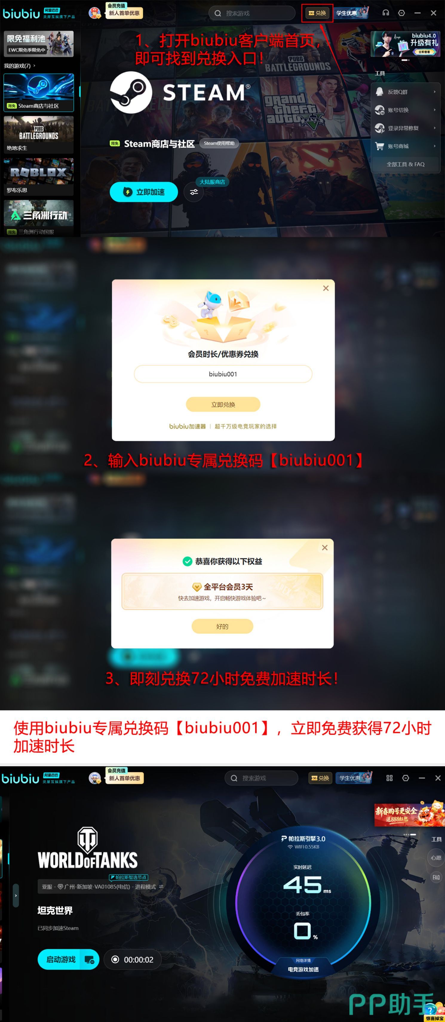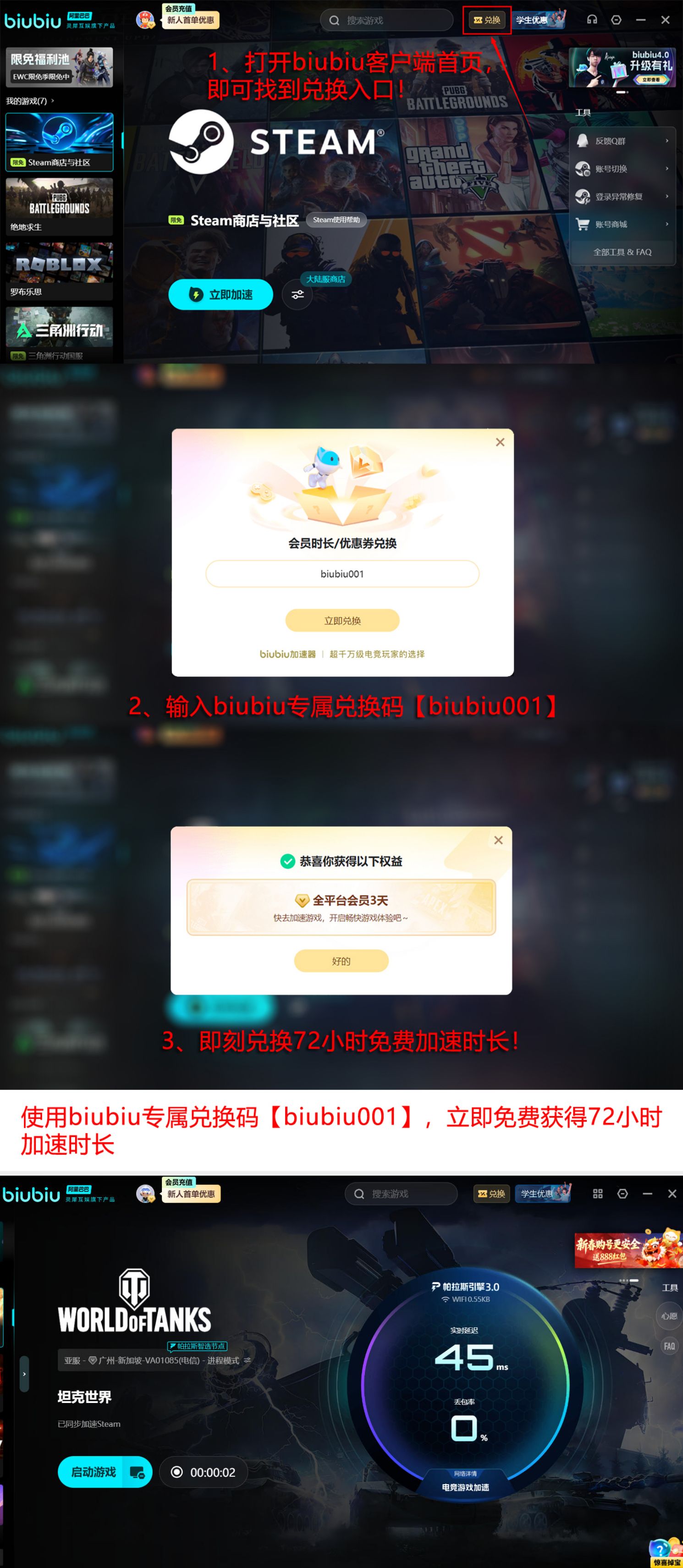 当前主流联机游戏普遍要求端到端延迟低于80ms、丢包率控制在0.3%以内,才能维持流畅交互体验。biubiu加速器由阿里巴巴灵犀互娱旗下技术团队研发,底层搭载自研帕拉斯3.0引擎技术,具备协议深度识别、TCP/UDP双栈优化及抗抖动增强能力。新用户完成注册即可获赠24小时全功能试用权限;所有用户输入专属兑换码【biubiu001】,均可领取额外三天加速权益,累计达96小时免费使用时长。