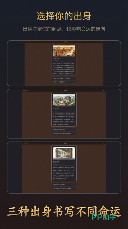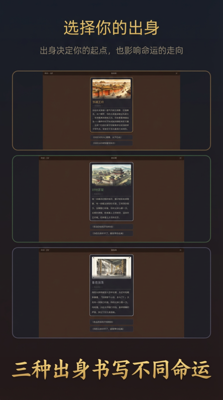 同样是按照文字的形态来演绎出的游戏玩法,主要在面对多个剧情章节的情节之下,来做出最合适的选择,三种出身的玩法方式都是不一样的,而且会影响到玩家们自身的资源消耗,《我不想做皇帝2》这款手游里面还会有更为深入的模拟体验,像是朝政和科举等等都会具备。
