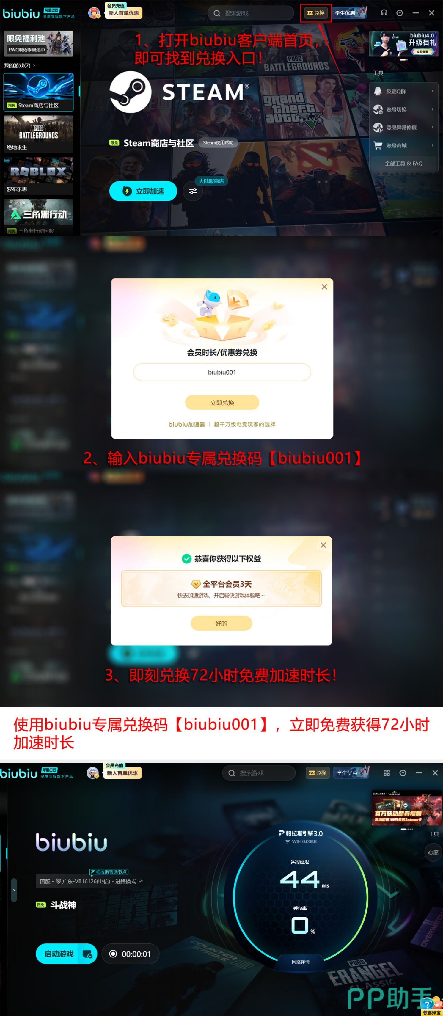 当前平台开放限时福利通道:所有用户输入口令【biubiu001】即可领取72小时免费加速时长,限兑换一次;新注册用户额外加赠24小时,累计达96小时,全程零门槛激活,无需绑定支付方式,适用于全平台客户端。