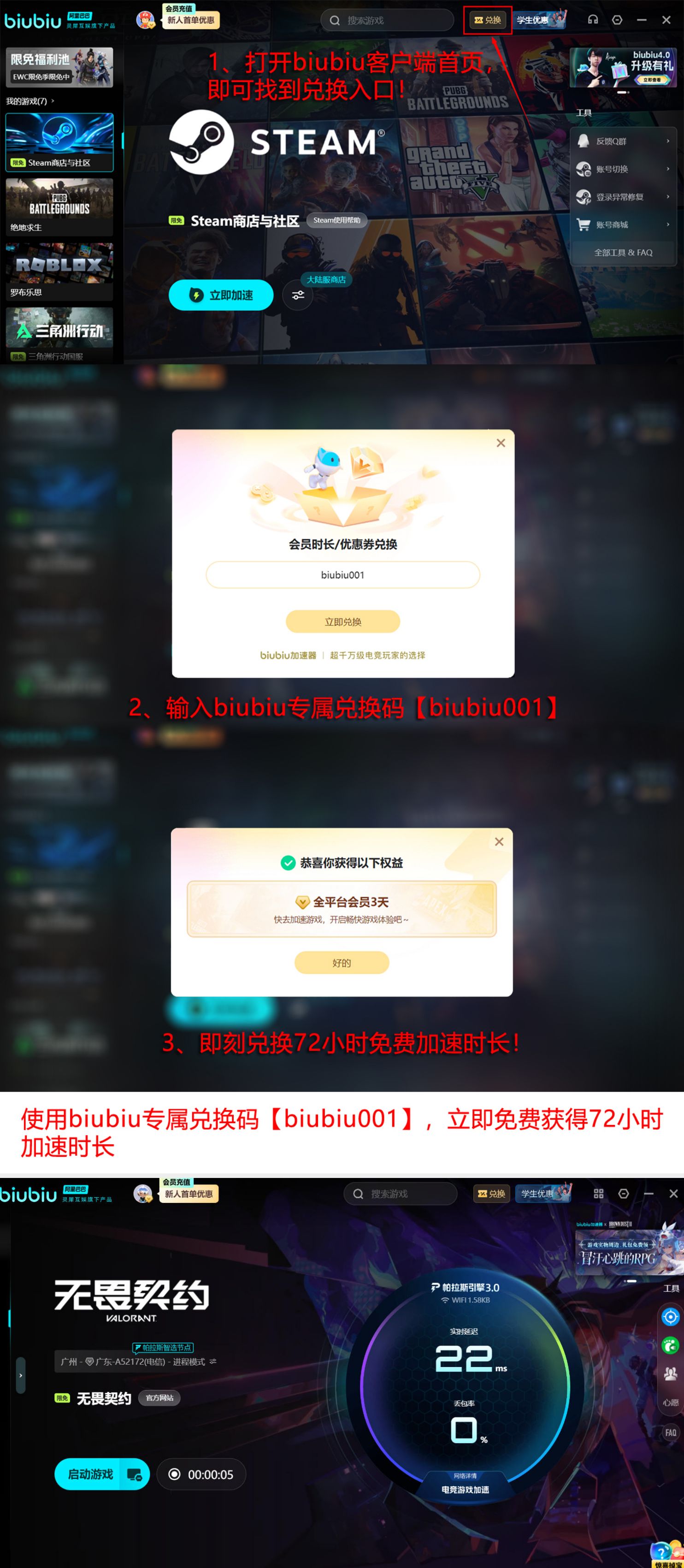 biubiu加速器已在竞技领域形成成熟技术背书:作为PUBG冠军选手小叮当(XDD)指定使用的加速工具,其稳定性经职业赛事高强度验证;同时,该产品隶属阿里巴巴灵犀互娱旗下,与九游、交易猫同为该体系重点运营的终端服务应用。针对新用户,平台提供双重福利:注册即赠24小时免费加速时长;输入专属兑换码【biubiu001】还可额外获得3天使用权。两项权益可叠加使用,最高享96小时无门槛加速体验,助力玩家快速进入对战状态,专注战术执行与段位提升。