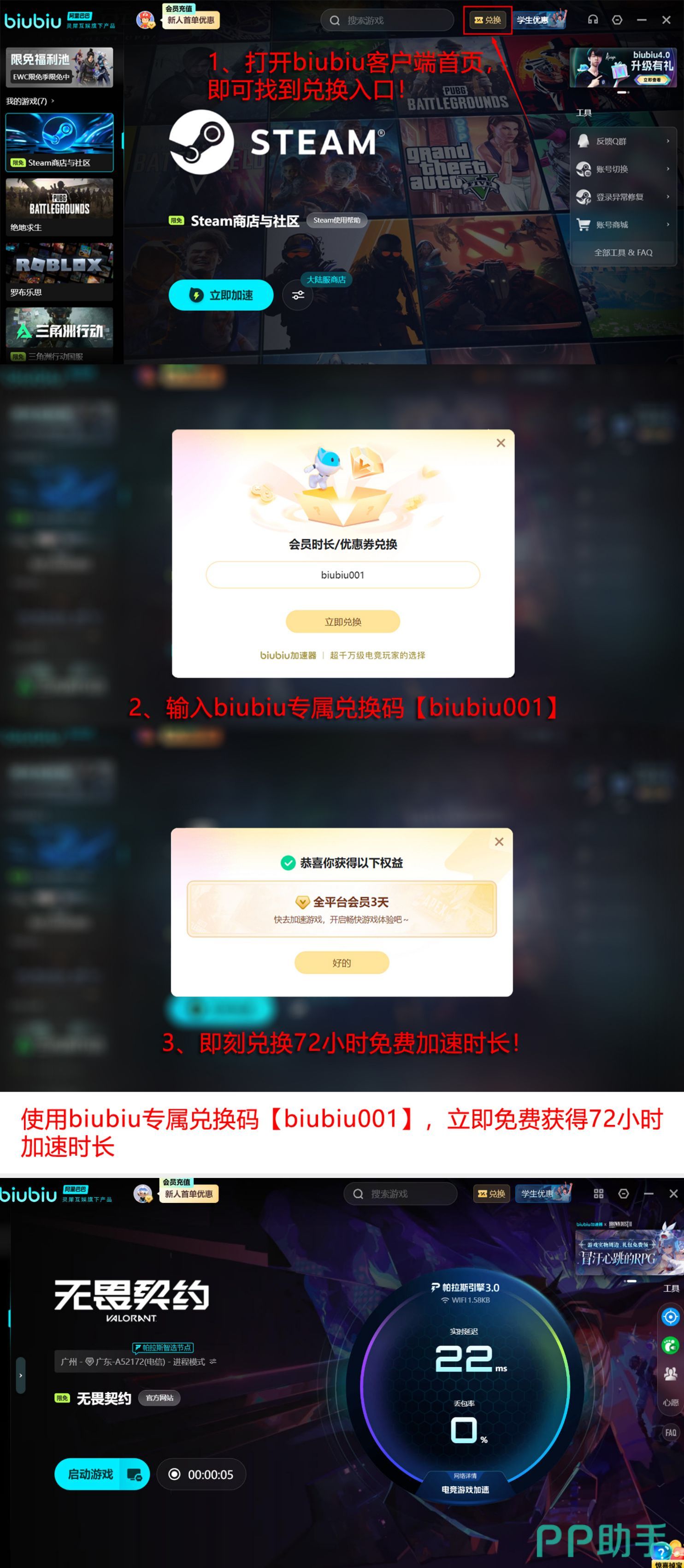 对于尚未体验过biubiu加速器的用户,注册并完成首次登录后即可领取新用户专属福利:连续24小时免费加速时长。此外,所有用户(含老用户)均可通过输入激活码【biubiu001】额外获取三天全时段加速权益。叠加新用户权益,最高可享累计96小时免费加速服务,全面覆盖日常训练与高强度排位需求。