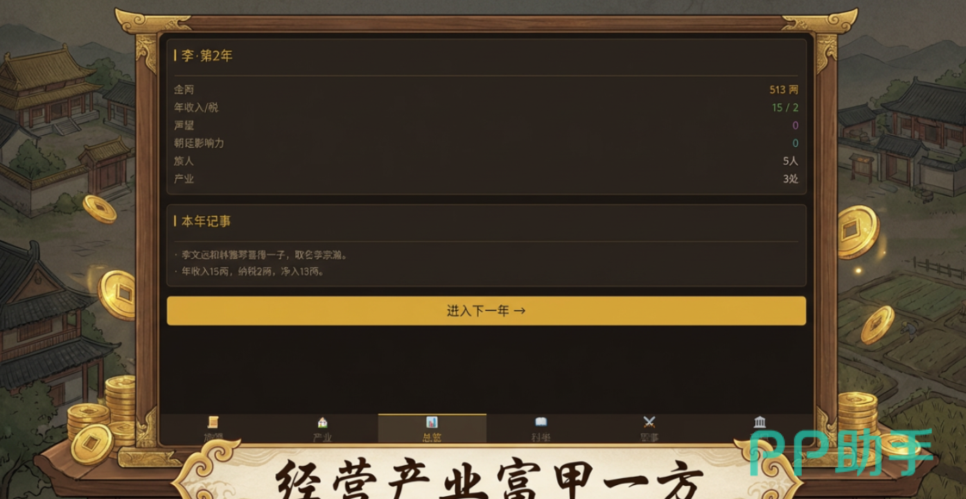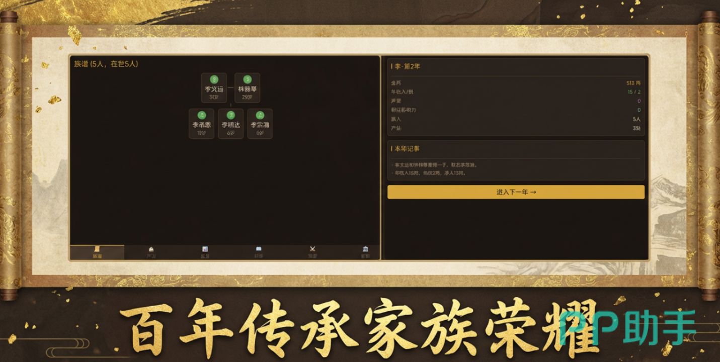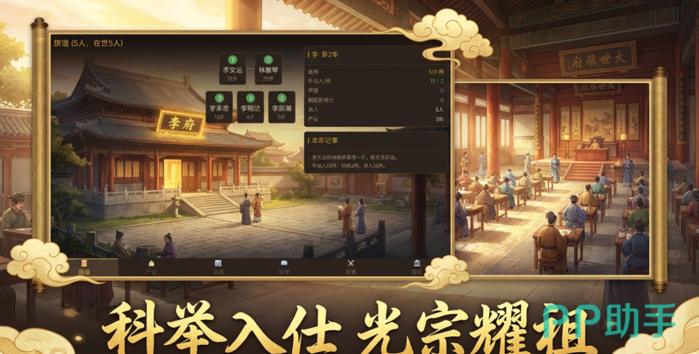 本作采用多代传承式家族发展模型,玩家不再操控单一角色,而是以家主身份统筹整个宗族的兴衰脉络。起始阶段仅有一对夫妇,但后续可通过联姻纳妾、抚育后代、延请幕僚等方式扩充家族成员;同时借助科举晋升、军功授爵、商业拓张等多元路径提升家族资产与社会声望,实现从寒门到望族的跨越式成长。