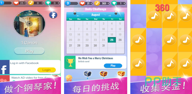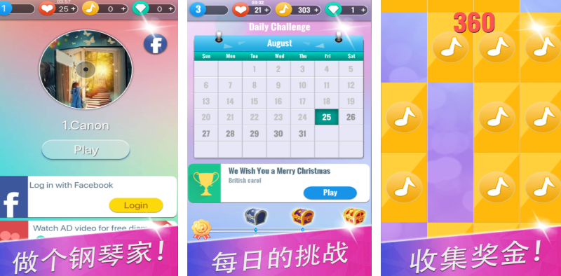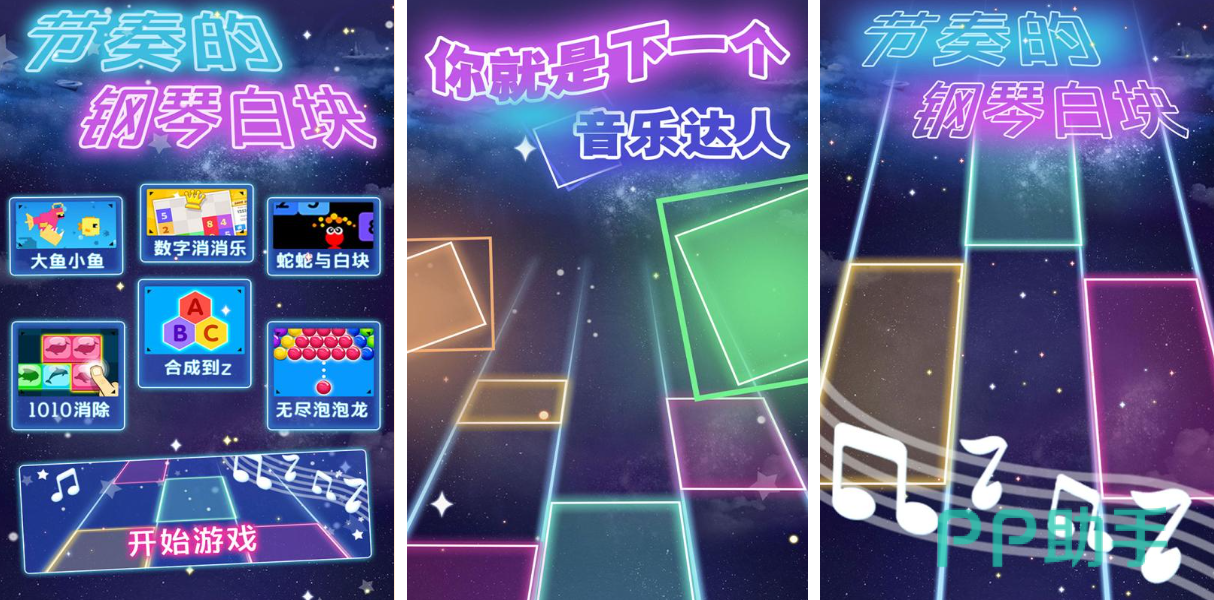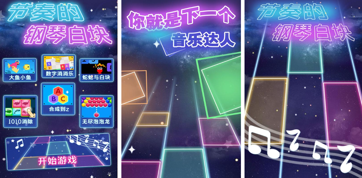 弹钢琴游戏爱好者都可以下载这款节奏音乐游戏尝试,本作采用绚丽的背景风格和不拘一格的玩法,除了点击钢琴块演奏音乐的玩法之外,还融合了泡泡龙和消除题材的模式可以挑战,玩家可任意选择自己喜欢的模式完成挑战任务,高度沉浸的休闲音乐节奏体验爽快度拉满,钢琴游戏爱好者试试这款弹钢琴神作吧。