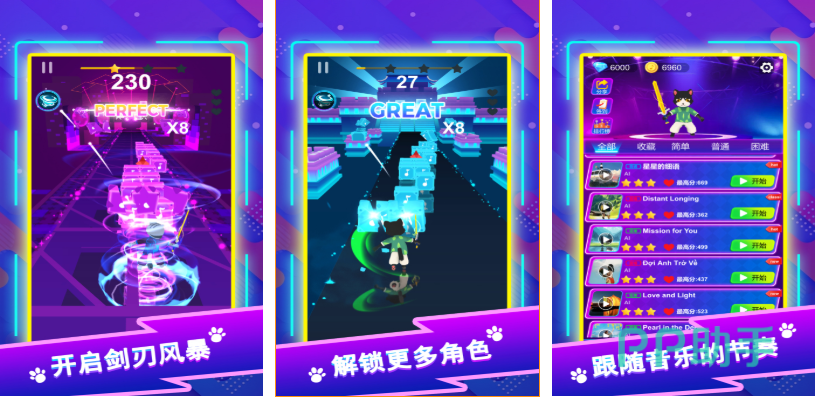 本作是款拥有小猫猫主角的音游闯关游戏,有着超多关卡和形形色色的猫咪皮肤,手持双刀的小猫猫可以根据节奏砍开道具,游戏特效极为完善也有着很酣畅的游戏节奏,小猫猫造型萌系再配以炫酷砍击特效观赏性不错,游戏设定了饱满深邃的曲库参与感十足,音游方面的资深粉丝均可在游戏中获得乐趣。