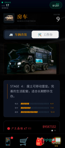 房车并非静态载具,而是贯穿全程的成长主线。初始仅是一辆基础款面包车,通过收集零件、完成事件、升级技能树,逐步加装防撞装甲、净水系统、太阳能板、床铺模块乃至小型火炮塔。每一次改造都实时呈现外观与功能变化:锈迹斑斑的车身被金属覆层覆盖,空荡车厢内陆续添置冰箱、灶台与种植槽。最终它将演变为兼具防御力、续航力与生活舒适度的移动生存单元——你的专属方舟,承载着秩序与希望。