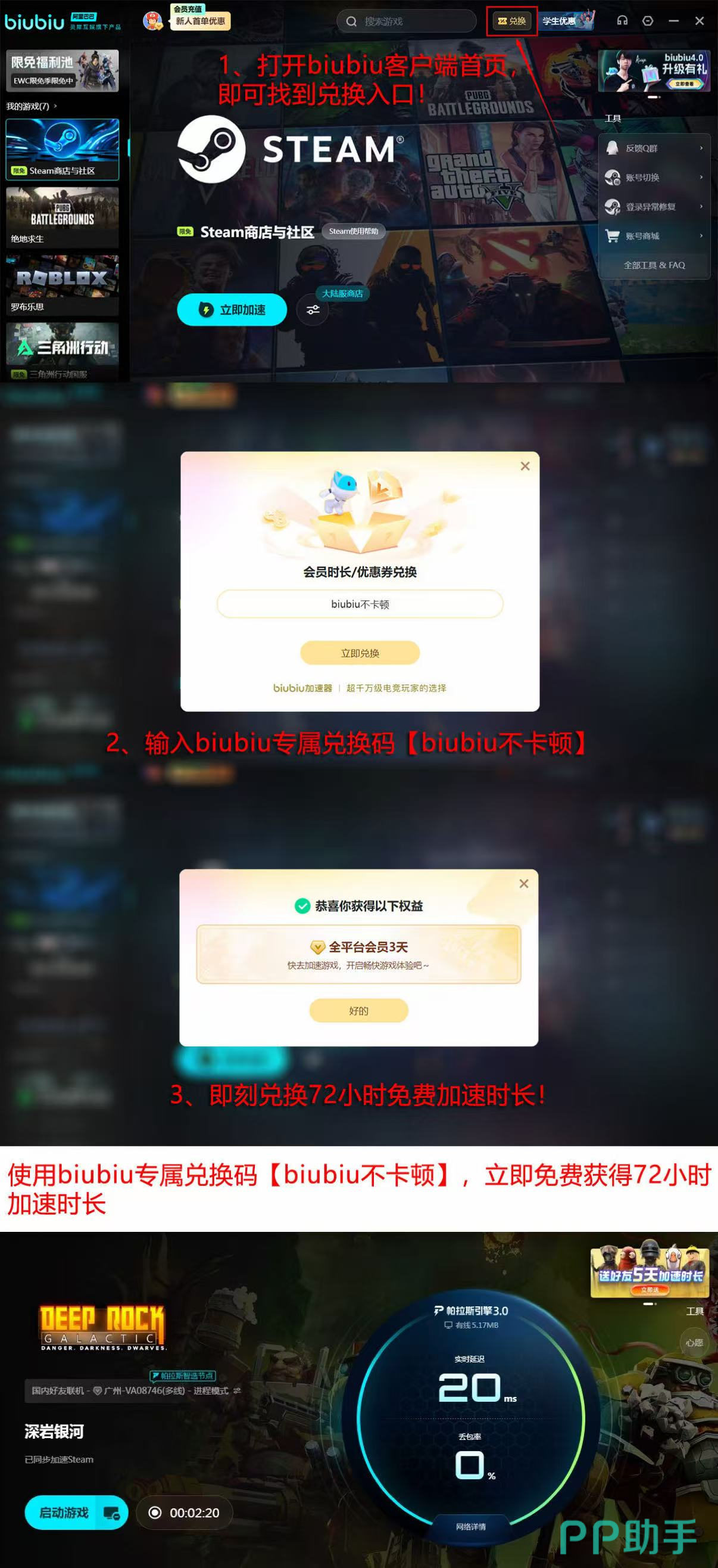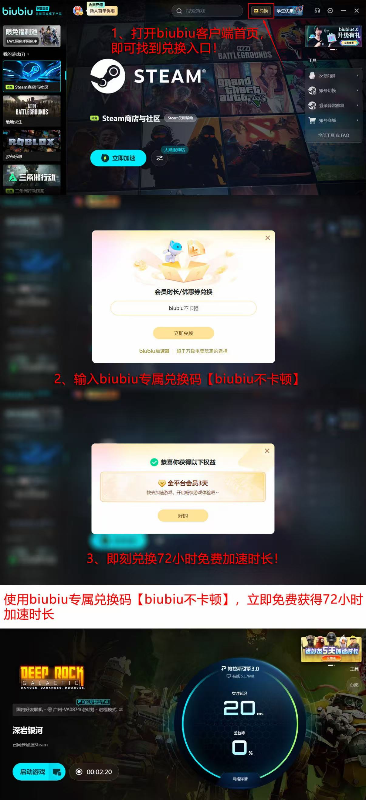 新用户注册后即可获赠24小时全节点加速时长,所有用户还可通过输入激活码【biubiu不卡顿】额外领取3天通用加速权益。免费时长支持叠加使用,新用户最高可累计享有96小时无门槛加速服务,覆盖《深岩银河》全部服务器区域及游戏内语音通信通道。