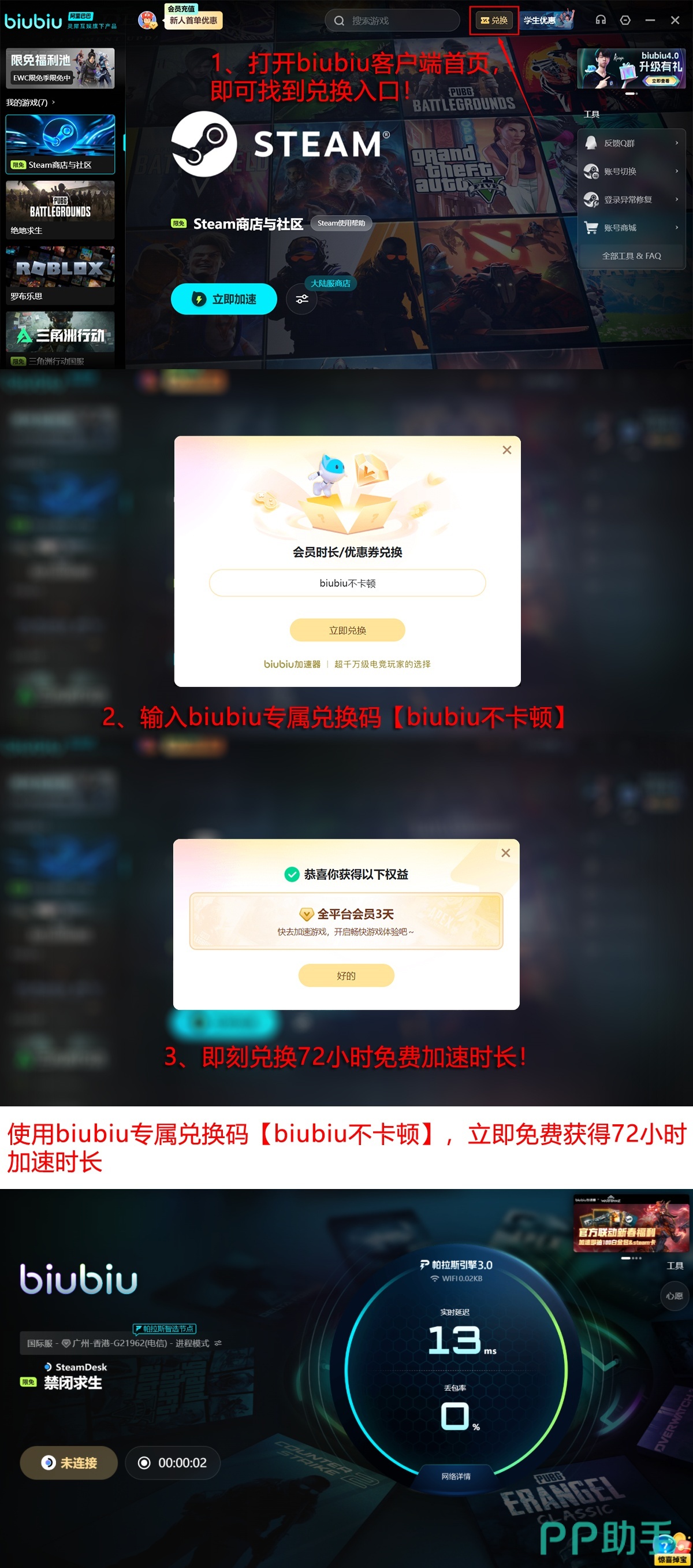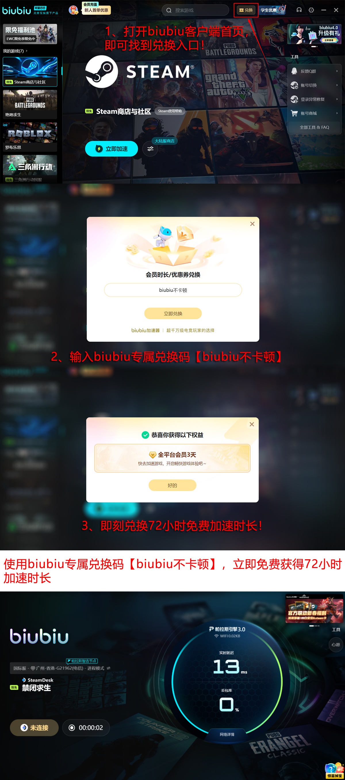 新用户可直接领取24小时全功能免费试用权限。输入专属口令【biubiu不卡顿】,还可额外获得3天加速时长。首次注册用户累计享有96小时无缝加速服务,覆盖完整开荒周期与多人协作全流程。