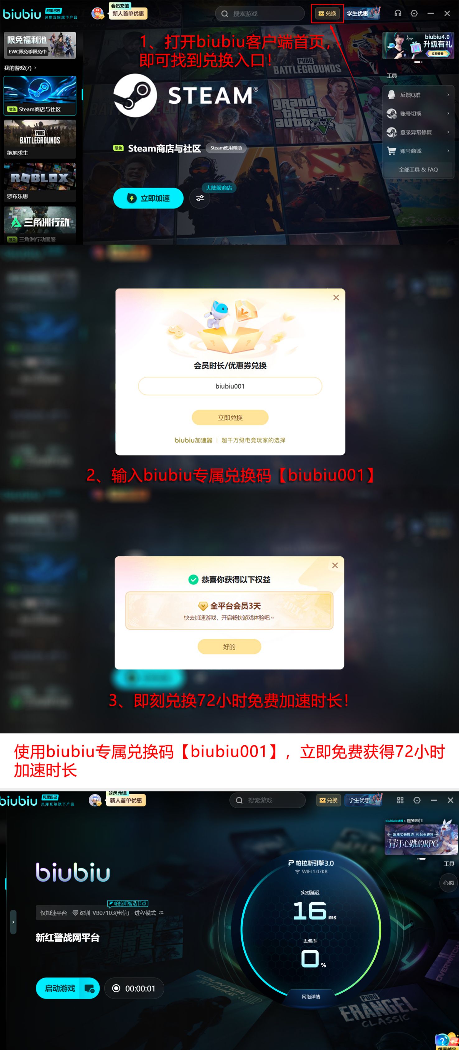该工具已通过多项电竞级压力测试,曾获PUBG职业选手小叮当参与实机调校并公开推荐。面向新用户,平台提供多重体验权益:输入激活码【biubiu001】即可领取三天免费加速权限;首次注册用户额外获赠24小时专属时长,累计可享96小时无门槛加速服务。