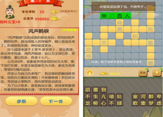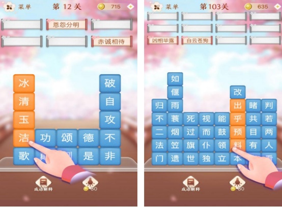 融合消除机制与传统文化知识的创新型益智游戏。玩家需在杂乱字阵中识别并点击四个汉字组成规范成语,成功匹配即消除。随关卡推进,成语长度、生僻度及数量同步提升,并附带释义查阅功能,实现娱乐性与文化积累双重价值。