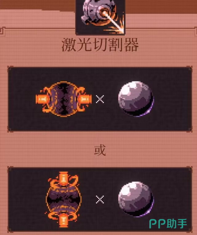 激光切割器需以横向激光或纵向激光任一类型,搭配钢铁弹珠合成(即黑铁+岩石)。需特别注意机制说明中的“正前方”定义——此处指弹珠自身行进方向,而非地图坐标系中的绝对垂直/水平轴向。方向理解偏差将直接导致技能释放角度错误,大幅削弱清场效率。