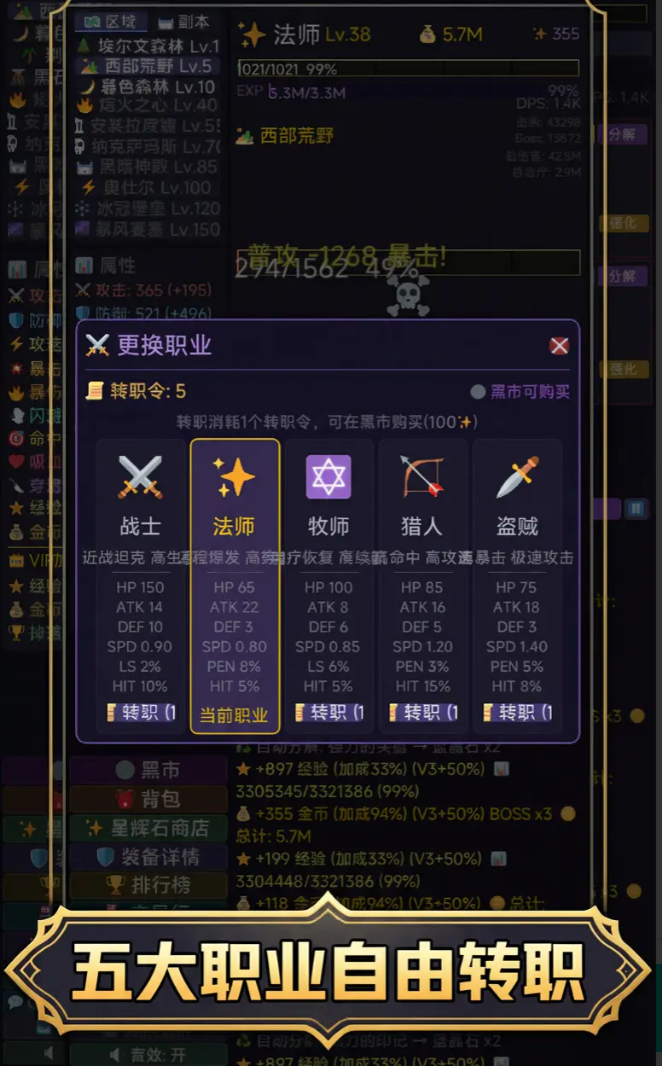 职业体系具备高度延展性,当前版本开放战士、法师、牧师、猎人、盗贼五大基础定位。各职业职能边界清晰:战士侧重生存阈值与单体物理压制;法师专注元素属性爆发与AOE覆盖效率;牧师承担团队续航与状态增益支持;猎人依赖远程持续输出与机动走位;盗贼则突出瞬时爆发伤害与闪避规避能力。角色支持无限次转职,且每次转职均可结合当前装备词条、属性点分配方案与天赋节点重置,实现千人千面的角色成长路径。