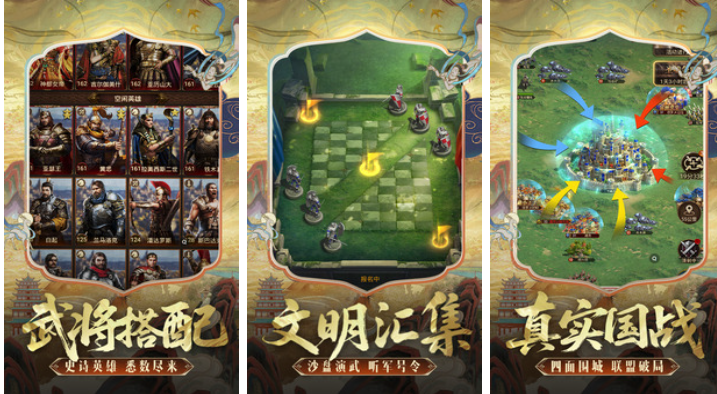 以多文明共存为世界观基础的跨时代国战策略游戏,涵盖华夏、罗马、波斯、玛雅、维京五大古文明阵营。各文明拥有专属兵种、科技树、建筑风格与领袖技能,例如罗马军团方阵、波斯不死军、维京狂战士等。操作界面采用横向卷轴式布局,降低上手门槛;国战采用赛季制推进,每赛季重置地图格局,确保公平竞技环境与持续新鲜感。