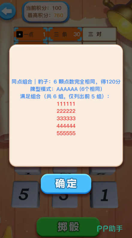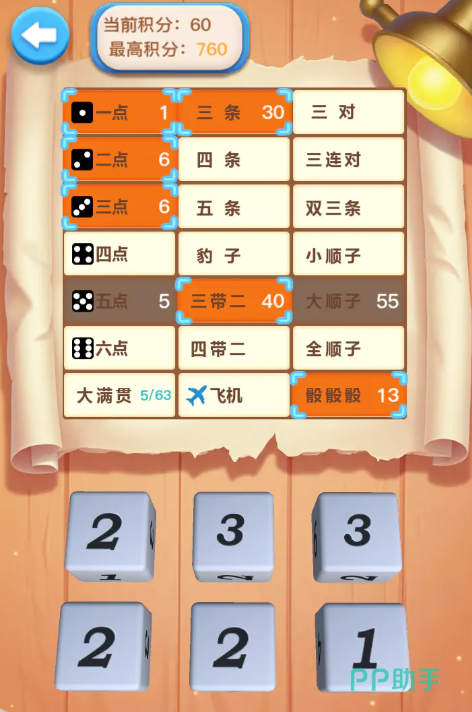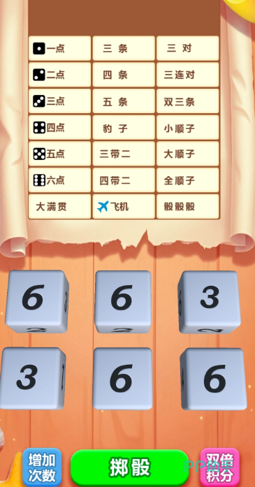 游戏采用六枚骰子投掷机制,玩家需在每轮两次掷骰机会中灵活决策:选择锁定部分点数后重投剩余骰子,或直接确认当前组合。目标是将结果匹配至记分板上的多种牌型,如大顺子(55分)、小顺子(35分)、豹子、三连对、飞机等。不同组合对应固定分数,合理规划投掷路径,是冲击高分的关键。