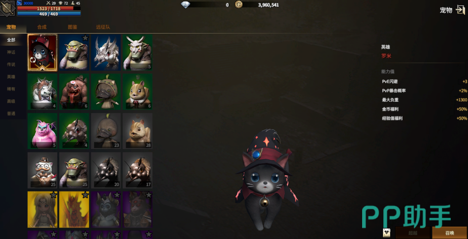 宠物按稀有度划分为蓝、红、紫、金四档,对应基础、精良、史诗、传说品质。品质直接决定属性加成幅度,是战力构成的关键变量。品质突破依赖合成机制:4只蓝色宠物可合成1只红色;4只红色合成1只紫色;而2只紫色即可合成1只金色宠物。该数值规则不可更改,为游戏内固定设定。