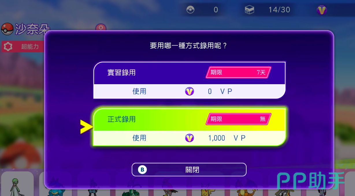录用系统是构建战队的第一步。玩家可通过该功能将目标宝可梦纳入麾下,自主决定主力阵容。当前提供两种录用方式:其一为“习惯录用”,有效期为7天,全程零VP消耗;其二为“正式录用”,需支付1000VP,成功后即可永久拥有该宝可梦。完成正式录用后,需进入兑换系统完成编队操作,方可将其投入实战。