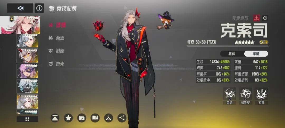 2技能“祭血荼”作用于敌方全体,造成基于自身生命值比例的范围伤害,同时有概率延长敌方目标及智壳的技能冷却时间,并反向缩短我方异格者与智壳的冷却轮数;3技能“死灵掠夜”为三段式单体攻击:首段具备驱散目标全部增益状态的概率,第二段可附加持续多回合的“防御下降”效果,第三段则存在偷取目标当前行动进度的几率——该机制能有效压缩敌方行动间隔,为我方争取先手优势与连动窗口。