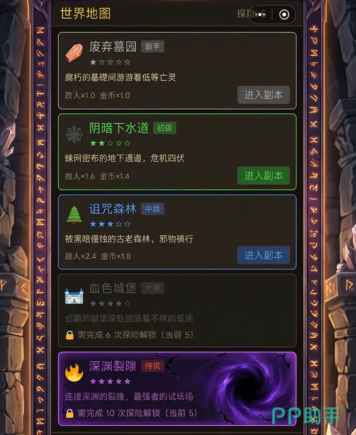 本作延续传统地牢RPG核心机制,开放多张差异化地图供玩家探索。各地图设有星级标识,难度梯度清晰:新手推荐优先挑战低星区域,在熟悉操作与机制的同时高效采集资源,用于角色等级提升与装备强化;待战力成型后,再逐步挑战高星副本以获取稀有产出。
