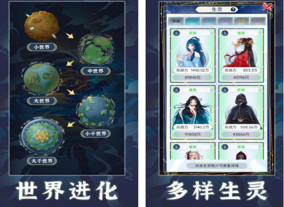 以世界创生为叙事主线,玩家从单一生灵起源出发,逐步拓展至多维空间结构。游戏内设灵族、妖族、魂族三大基础种群体系,每种种族具备独立成长曲线与战力模型。通过资源调配、环境改造与跨域征伐,推动世界层级由小千界升格为大千世界,最终实现万灵共生、诸法自洽的终极形态。