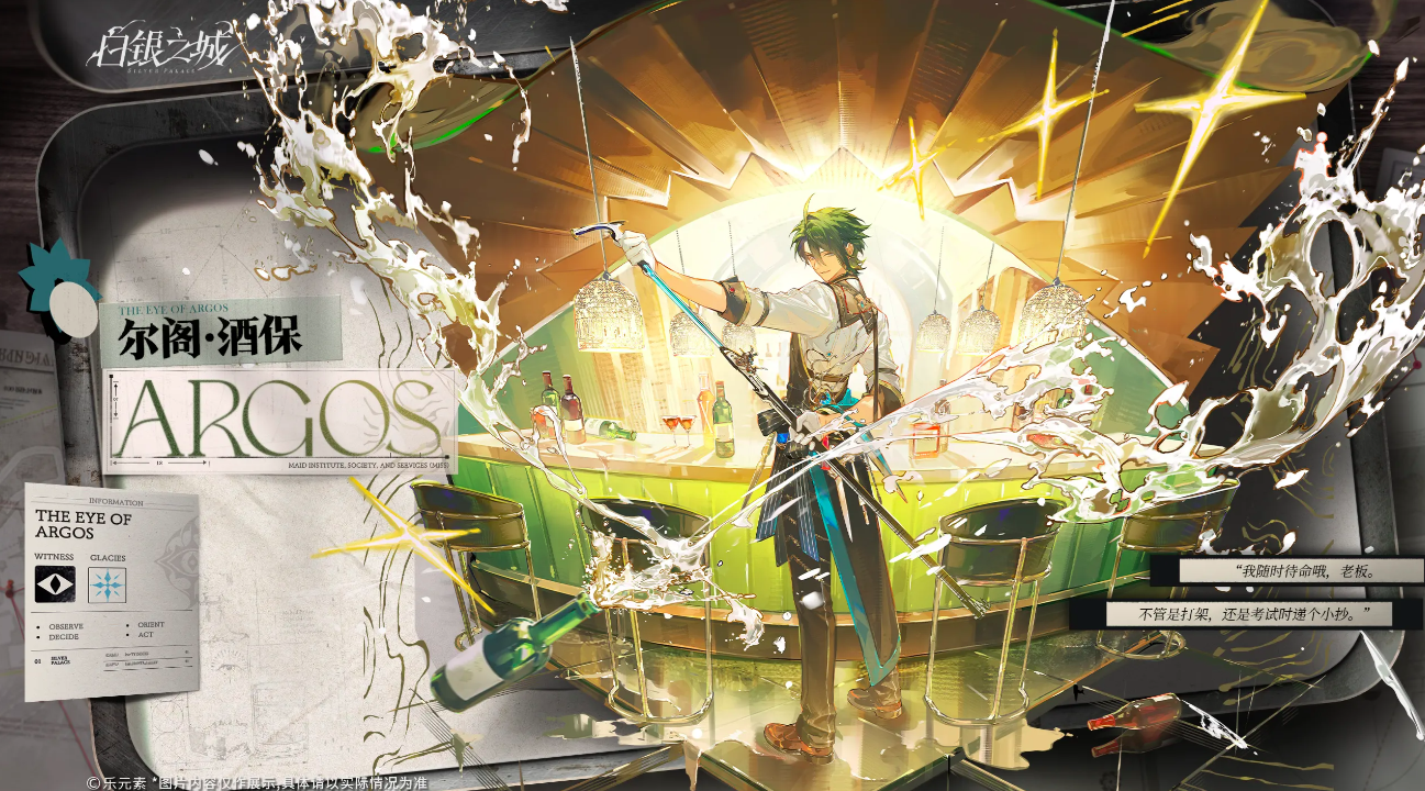 第三位是尔阁酒保。其身份远超普通调酒师——在人员混杂的尔阁酒馆中,他常年佩剑携枪应对突发冲突。战斗定位为团队辅助,核心机制为群体恢复:当队友陷入疲态时,可通过技能释放提供生命值回复与状态缓释效果。其标志性交互方式为雪克杯,象征其以调酒技艺承载支援职能。