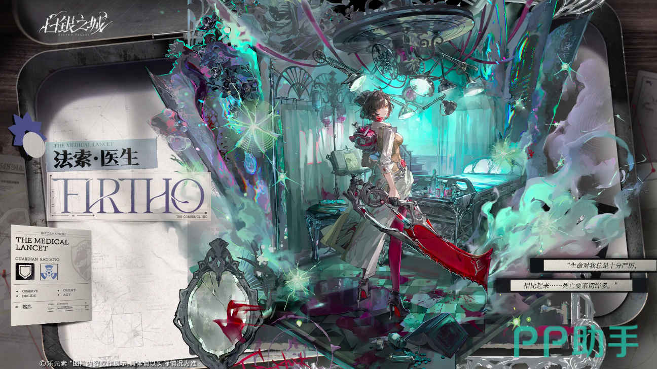 第二位为法索医生。她以冷静疏离的医者姿态示人,职业定位为高输出型治疗者。日常活动区域集中于诊所密室,所有技能设计均围绕医学概念展开,例如以手术刀式攻击实现高额单体爆发。“长城”为其标志性技能名称,可对目标造成致命打击。角色设定中明确存在先天性疾病,依赖维生装置维持生命状态;其性格抗拒怜悯,亦排斥被视为负担,因此深化角色关系的关键路径之一,即是使其充分参与前线作战。