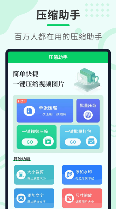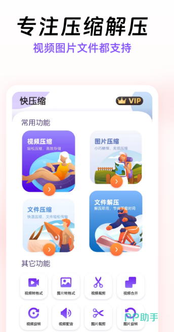 压缩助手也是可以一键压缩文件以及视频的软件,这款工具功能强大可以帮助大家压缩手机设备中的文件,解压以及压缩功能齐备使用起来极为方便,在问价压缩功能基础上增加了图片加水印功能,在日常生活中可以轻松用这些更能处理工作,快捷简单的控制体系可以轻轻松松实现文件的压缩,运行光速不卡很适合不会处理文件的新手小白。