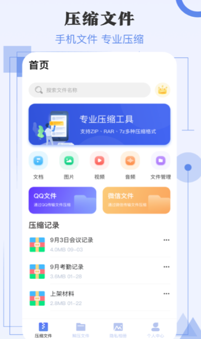 文件压缩是十分专业的一款移动端辅助管理文件的软件,加入了多样的文件压缩和管理功能,能够同时对形形色色的文件进行行压缩与解压,很方便的操作体系可让小白成为文件管理大师,还设定了更多的文件加密功能增添了APP的实用性,这款APP功能众多也有着保护隐私的辅助效果,如果你的手机或者电脑里文件非常复杂,就可以下载这个压缩文件的APP试一下。