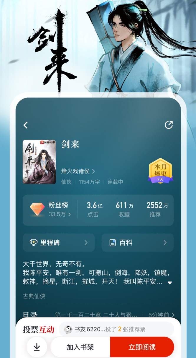 《剑来》《太荒吞天诀》这些顶级IP的独家连载权在这里,还有不少网络文学大神的签约首发新作,玄幻、都市、言情、军事这些题材的资源质量都在线。背景主题、字体选择、行距段距都能自己调,护眼和仿真翻页模式也有,细节打磨得比较用心。多端登录进度同步,离线缓存预读这些功能齐全,语音朗读音色和语速可选,用着不别扭。书评社区很活跃,每天讨论量不少,偶尔还有作者出来互动,读者和作者之间的距离感没那么强。