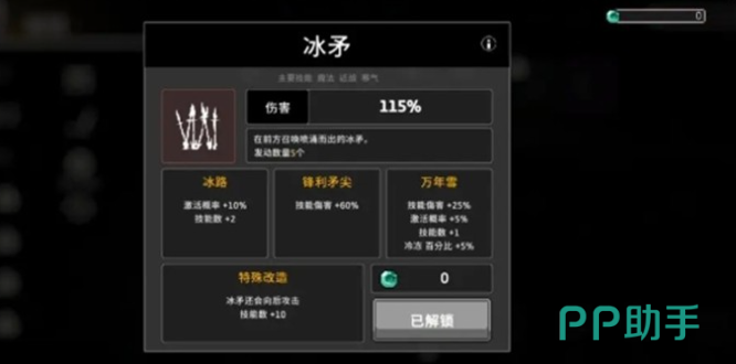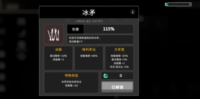 起手配置无需过度纠结:主武器推荐奥伯龙,其附带的飞雷神机制可显著增强位移灵活性,便于风筝输出;宠物选用救生员,可在Boss战中提供两层临时护盾,大幅提升容错率;增益类技能直接沿用系统预设的冥想,无需额外解锁,稳定提升基础属性。核心输出技“冰剑”的解锁存在严格前置条件——必须先获取“冰矛”道具。该道具需在第三章中,连续三次通关骷髅Boss且全程未被骷髅兵击中,方可获得。