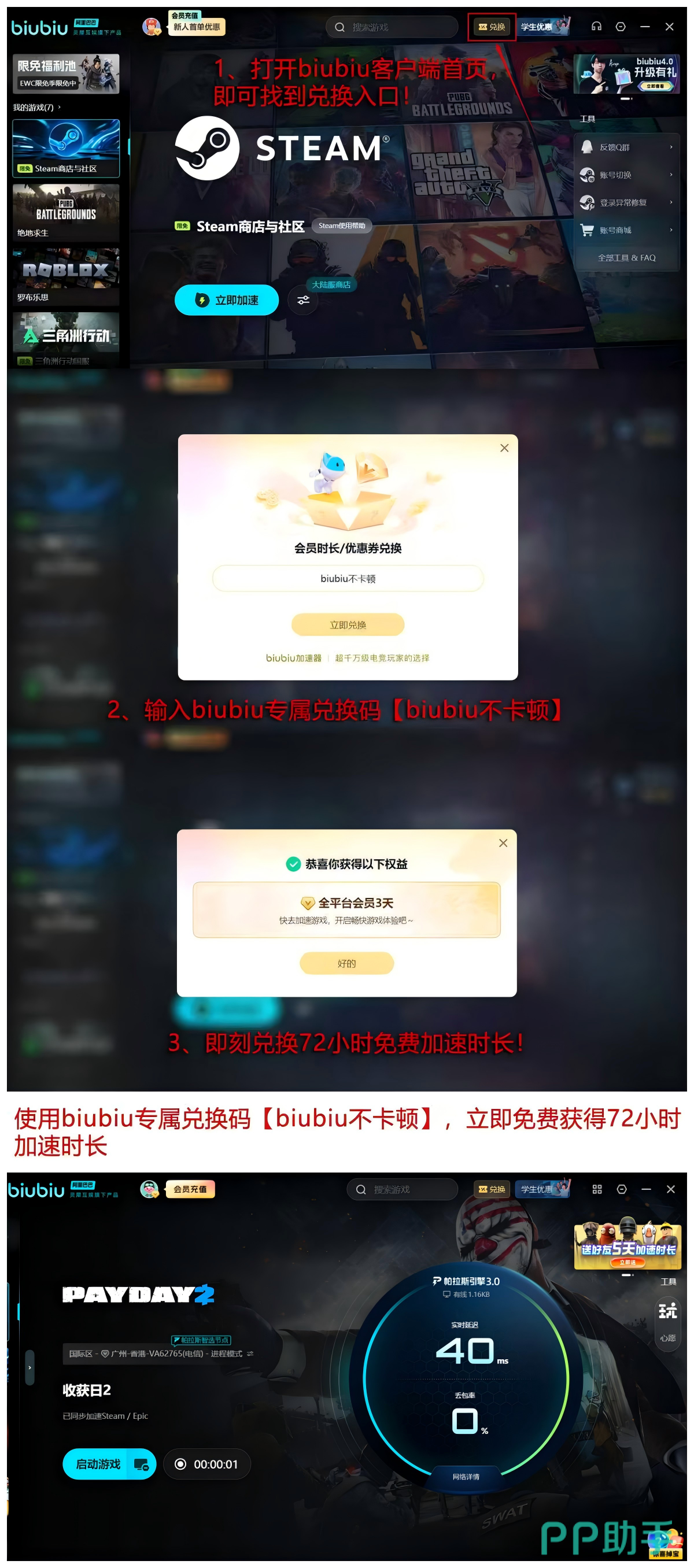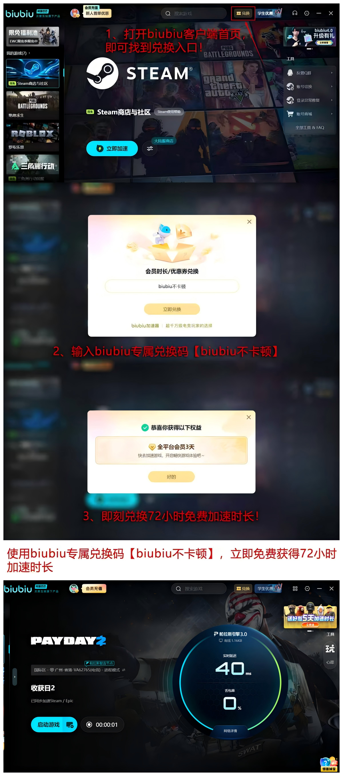 输入兑换码【biubiu不卡顿】,即可在72小时内激活加速服务;新人注册后还可叠加获取24小时新手加速时长,总计享96小时无限制加速权益,覆盖完整游戏周期,切实提升联机稳定性与加载效率。