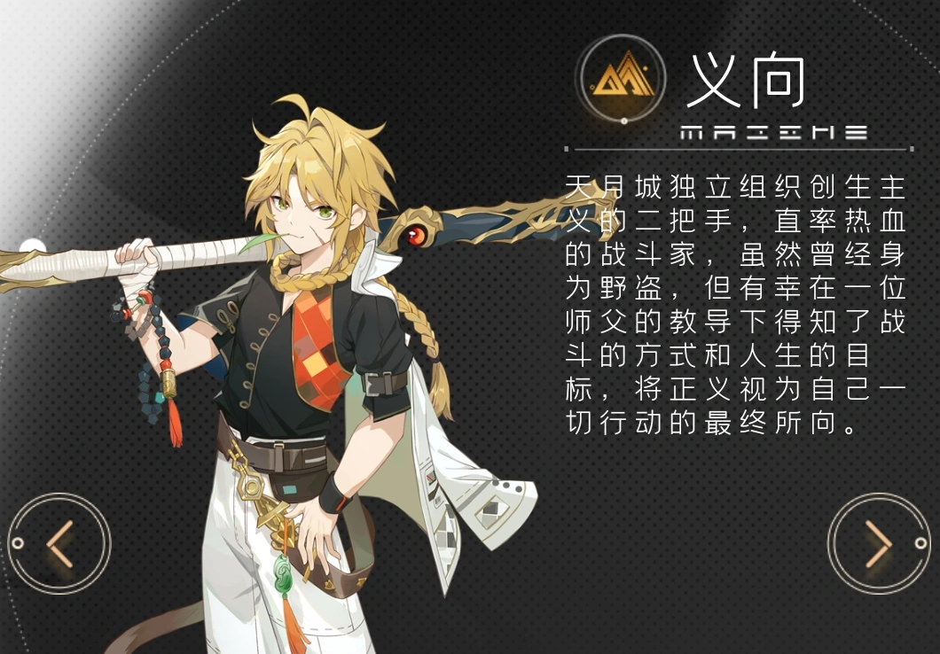 义向:天月城创生主义成员,土属性近战输出角色。技能组合强调连段流畅性与节奏把控,具备多段位移、突进压制及高瞬时爆发能力;但因身板较脆,需队友提供视野保护与控场掩护,方能最大化其输出潜力。