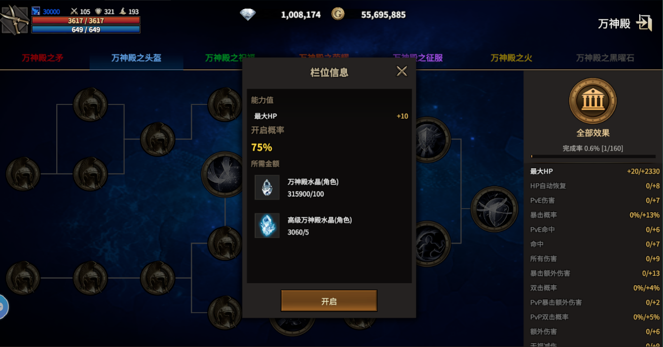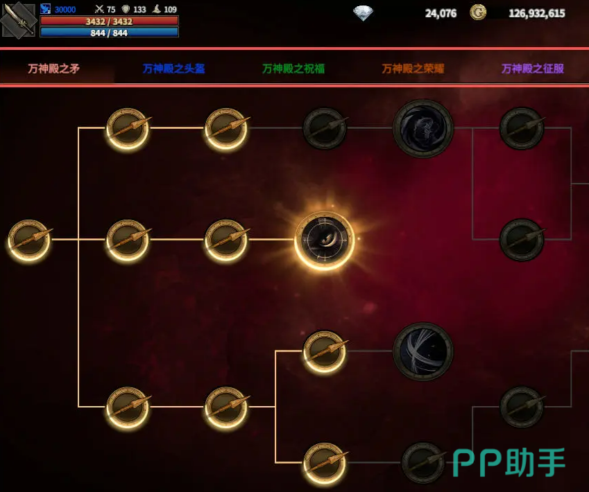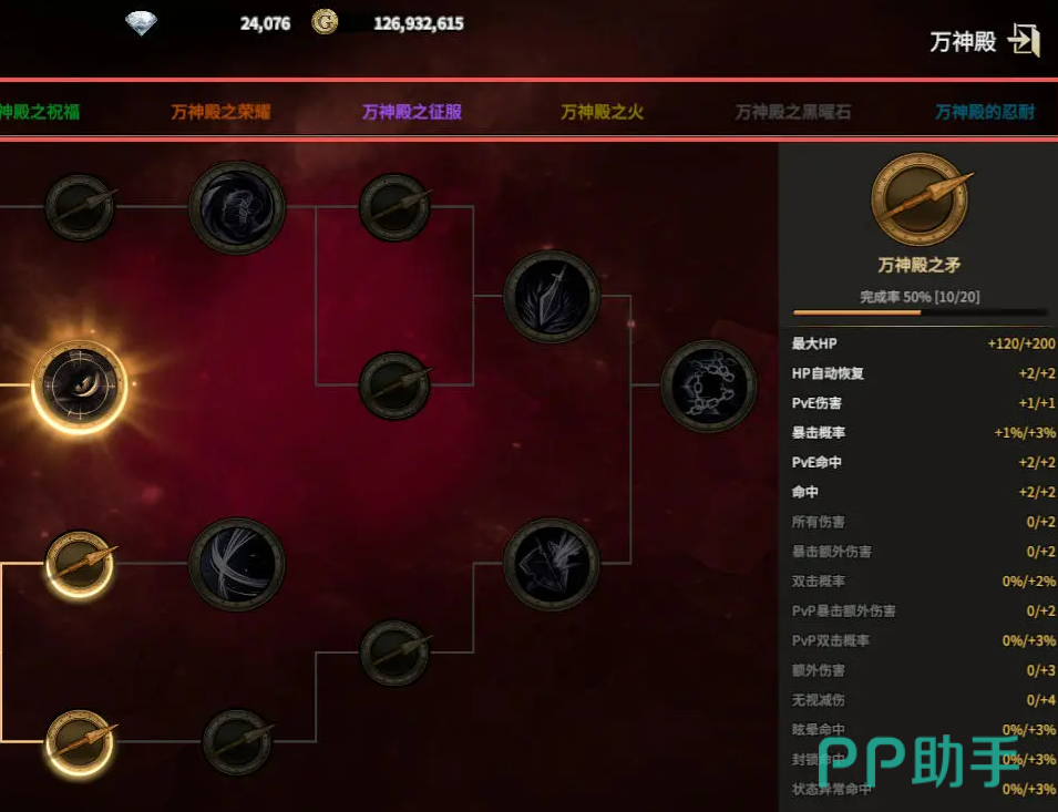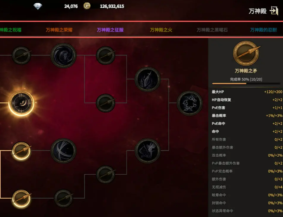 路径选择共设七条独立分支,各具功能定位。新手期推荐优先集中资源发展“万神之矛”与“星星之火”两条路径:“万神之矛”提供全伤害加成及PVP专项增益,“星星之火”强化输出能力,二者协同可快速构筑主力输出体系,为后续副本攻坚与竞技场对抗奠定基础。生存向玩家可适时投入“万神殿头盔”,其抗性与减伤属性有效提升容错空间。注重日常效率的用户宜关注“万神殿祝福”,该路径的经验获取加成、负重上限提升与技能冷却缩减,对挂机发育与等级追赶具有实质助益。其余如“万神殿荣耀”“万神殿之火”“万神殿黑耀”“万神殿忍耐”等路径,多聚焦PVP场景下的特殊机制,建议在中后期根据自身对战需求逐步补足。