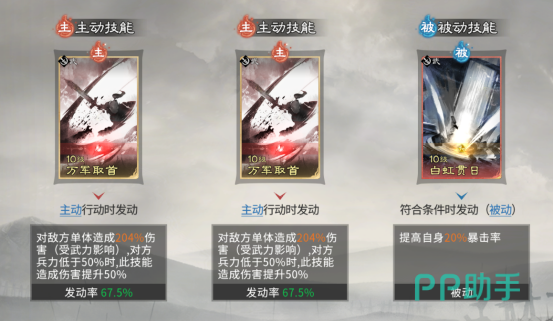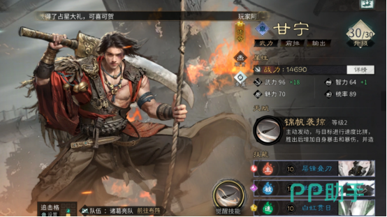 技能配置上,甘宁主动技必选【万军取首】,该技能基础倍率优异,且对兵力低于30%的目标额外提升伤害,契合收割定位;追击技栏位无需填充,保留空置以保障技能链稳定性;被动技首选【白虹贯日】,固定提升20%暴击率,配合其高暴伤属性,可快速打出成吨爆发输出,显著缩短战斗时长。